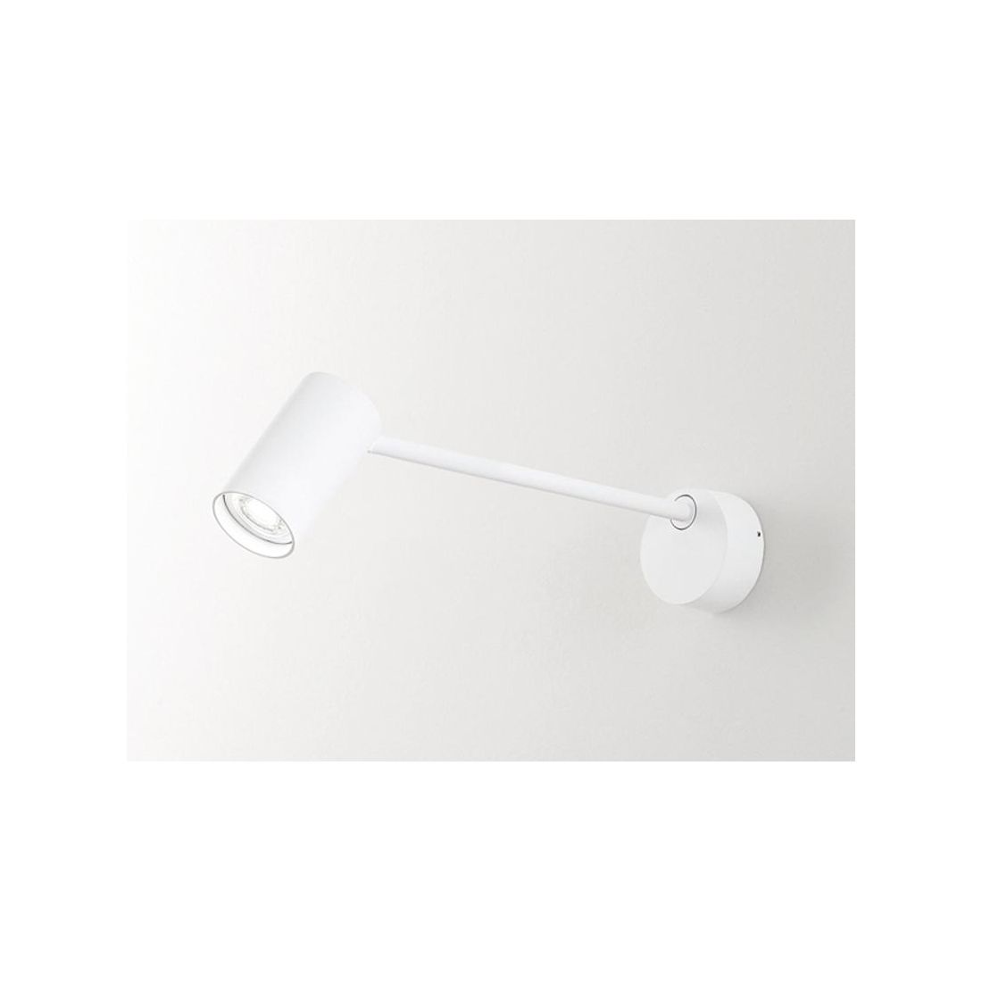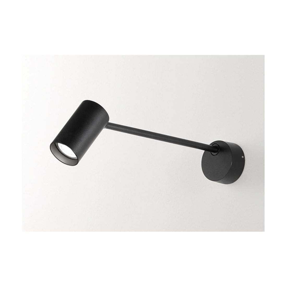 Lampada da parete oppure da soffitto, con una lunghezza totale di cm 41, composta da una piccola basetta rotonda e da uno stelo sottile dove viene ancorato uno spot orientabile, il tutto realizzato in alluminio verniciato di bianco opaco o di nero opaco (a vostra scelta).