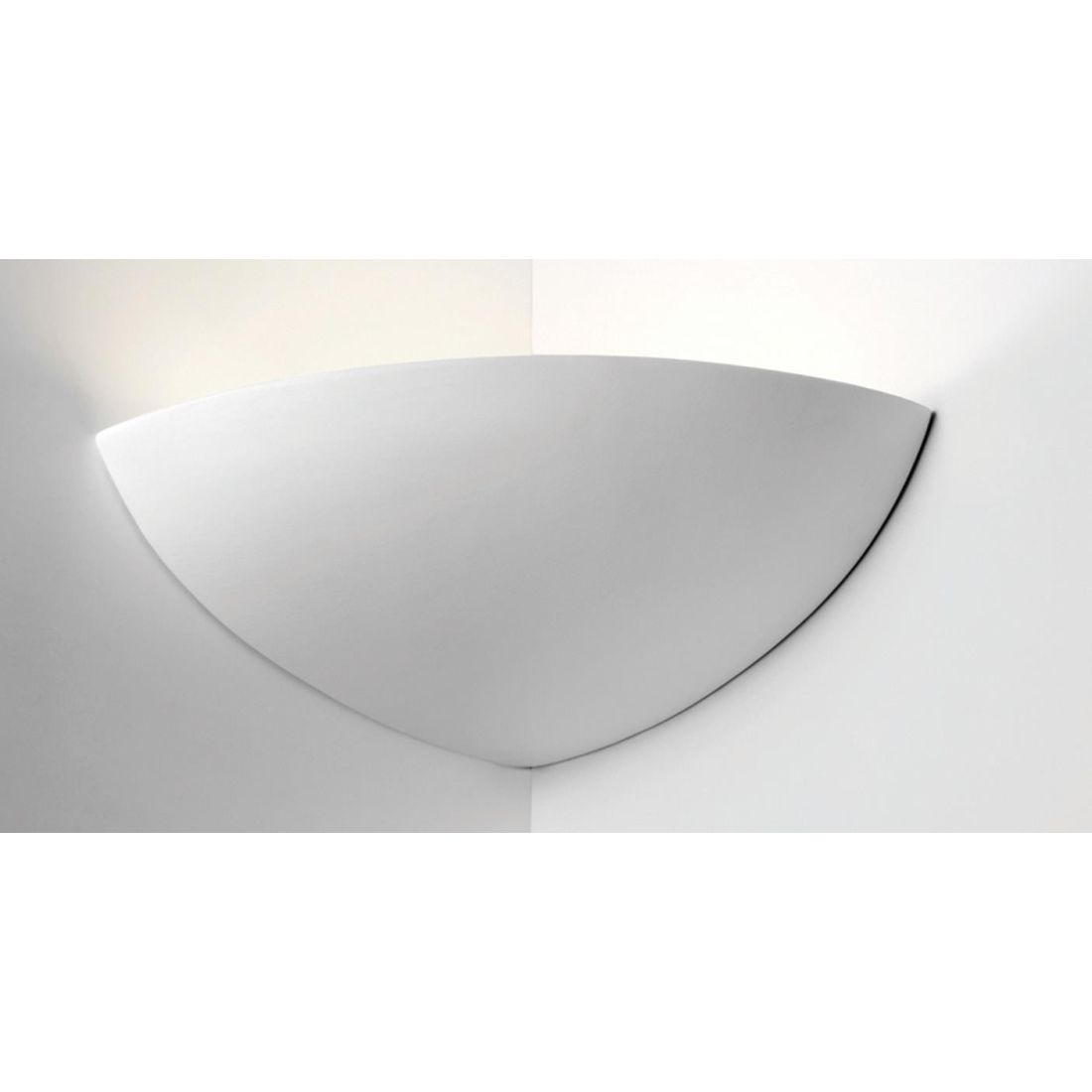 Applique da parete angolare, prodotta in Italia dalla Belfiore 9010, realizzata in ceramica effetto gesso, verniciabile a piacimento con un normalissimo colore di pittura, con una struttura a forma di calice tondeggiante dove la luce viene proiettata direttamente verso l'alto; la peculiarità dell'installazione ad angolo permette di completare l'illuminazione.