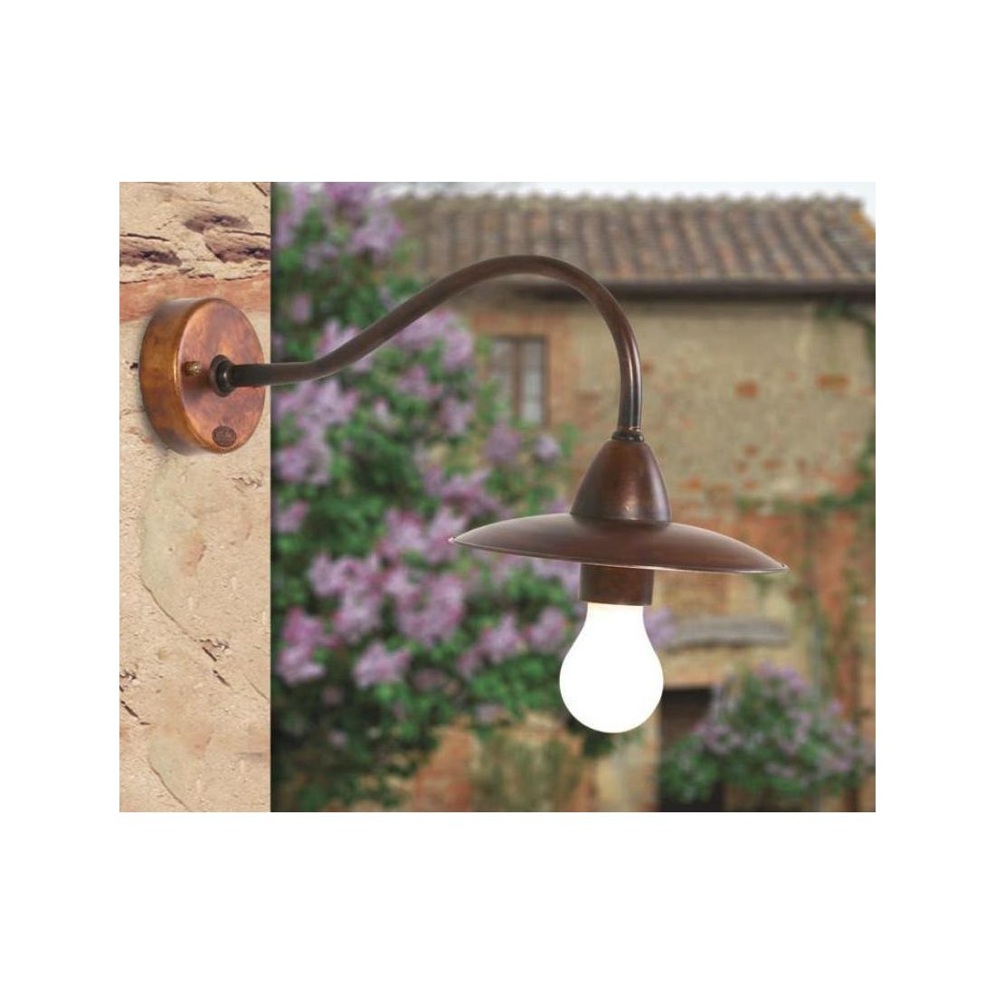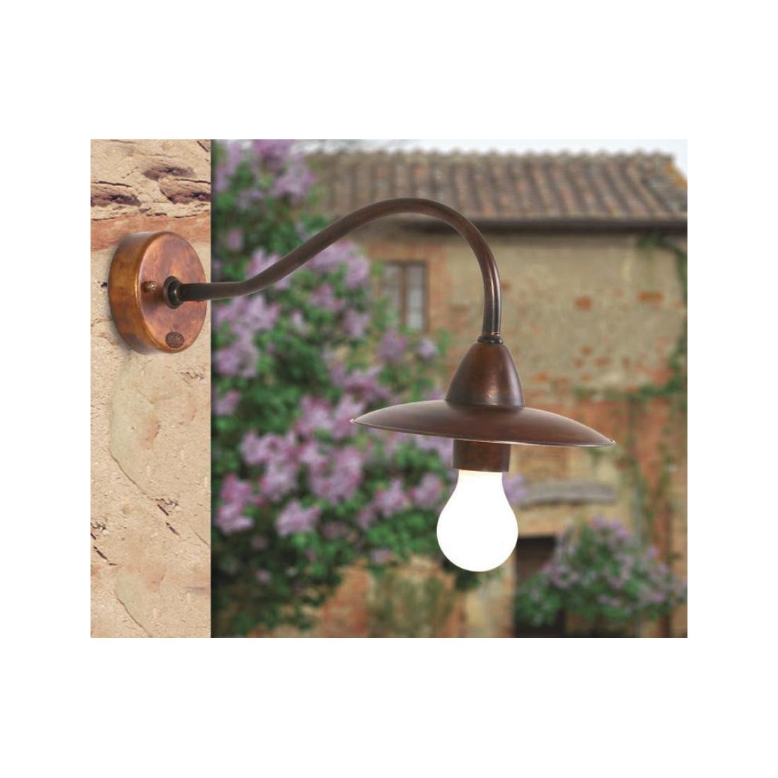 Lampada da parete dallo stile rustico, adatta ad ambienti esterni, 100% Made in Italy, prodotta dalla Imas Firenze, con braccio e piatto del diametro di cm 20 realizzati interamente in Ottone invecchiato, con lampadina a vista, senza alcuna protezione, che produce una luce diffusa nell'ambiente.