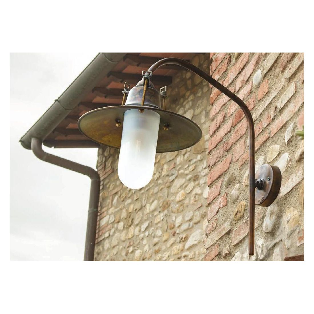 Lampada da parete, dallo stile rustico, adatta ad ambienti esterni, con il braccio lungo e curvo e con un piatto del diametro di cm 20 interamente realizzati in Ottone invecchiato con il vetro satinato utile alla protezione della lampadina.