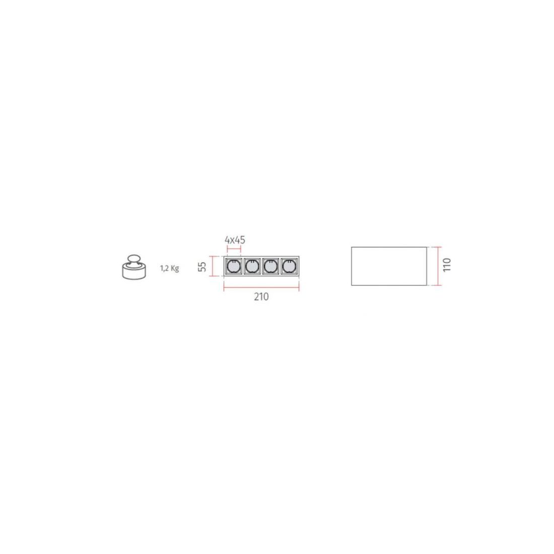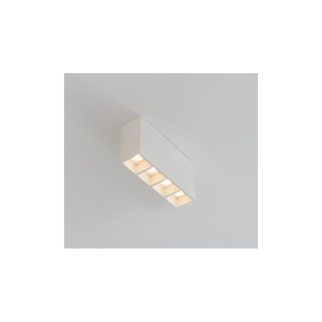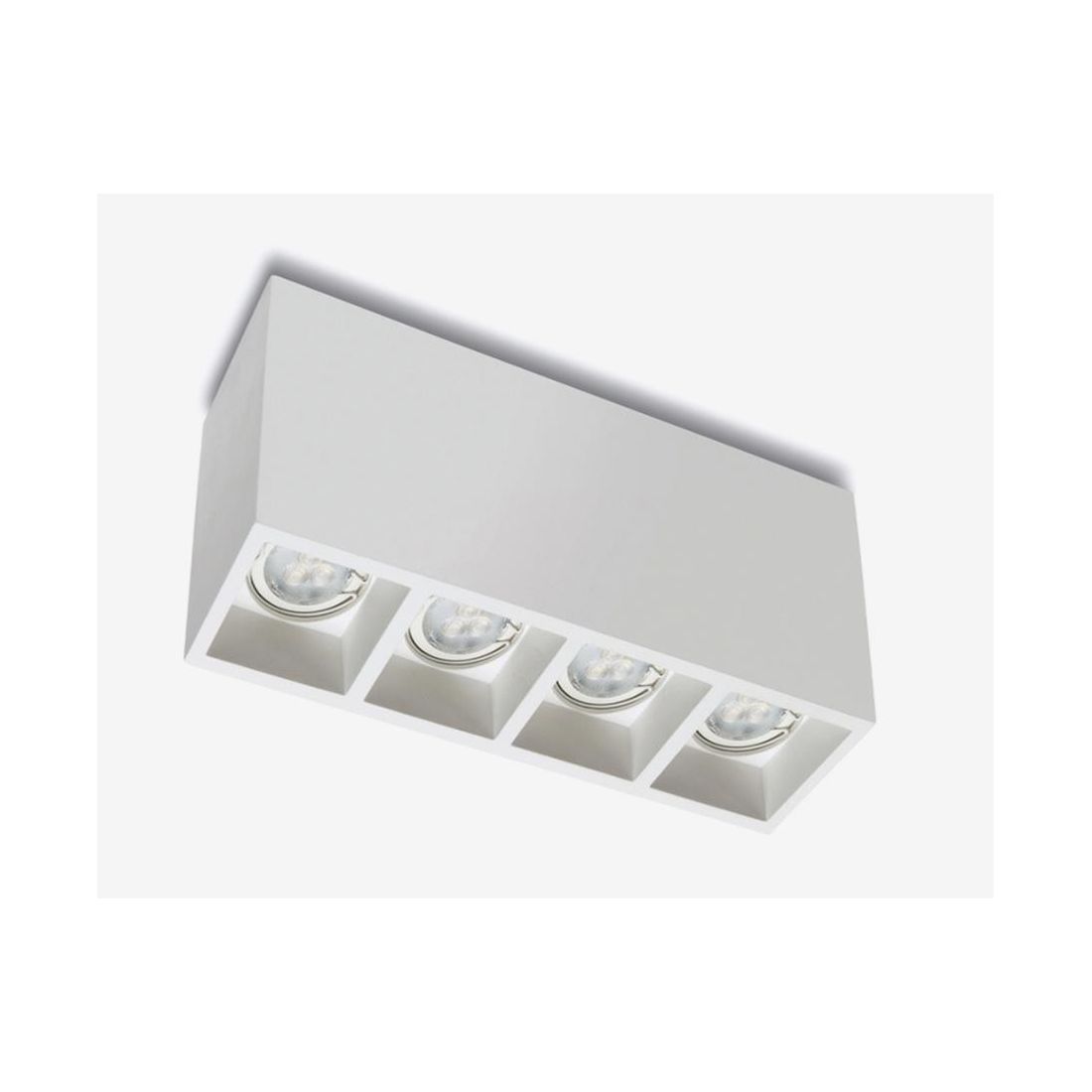 Plafoniera con un design moderno, che si presenta con una struttura a forma di parallelepipedo realizzata in Cristaly *, verniciabile a piacimento con un normalissimo colore di pittura, al cui interno sono posizionati quattro faretti installati singolarmente in appositi spazi; la luce fuoriesce dalla parte inferiore della plafoniera e risulta adattabile a qualsiasi tipo di necessità.