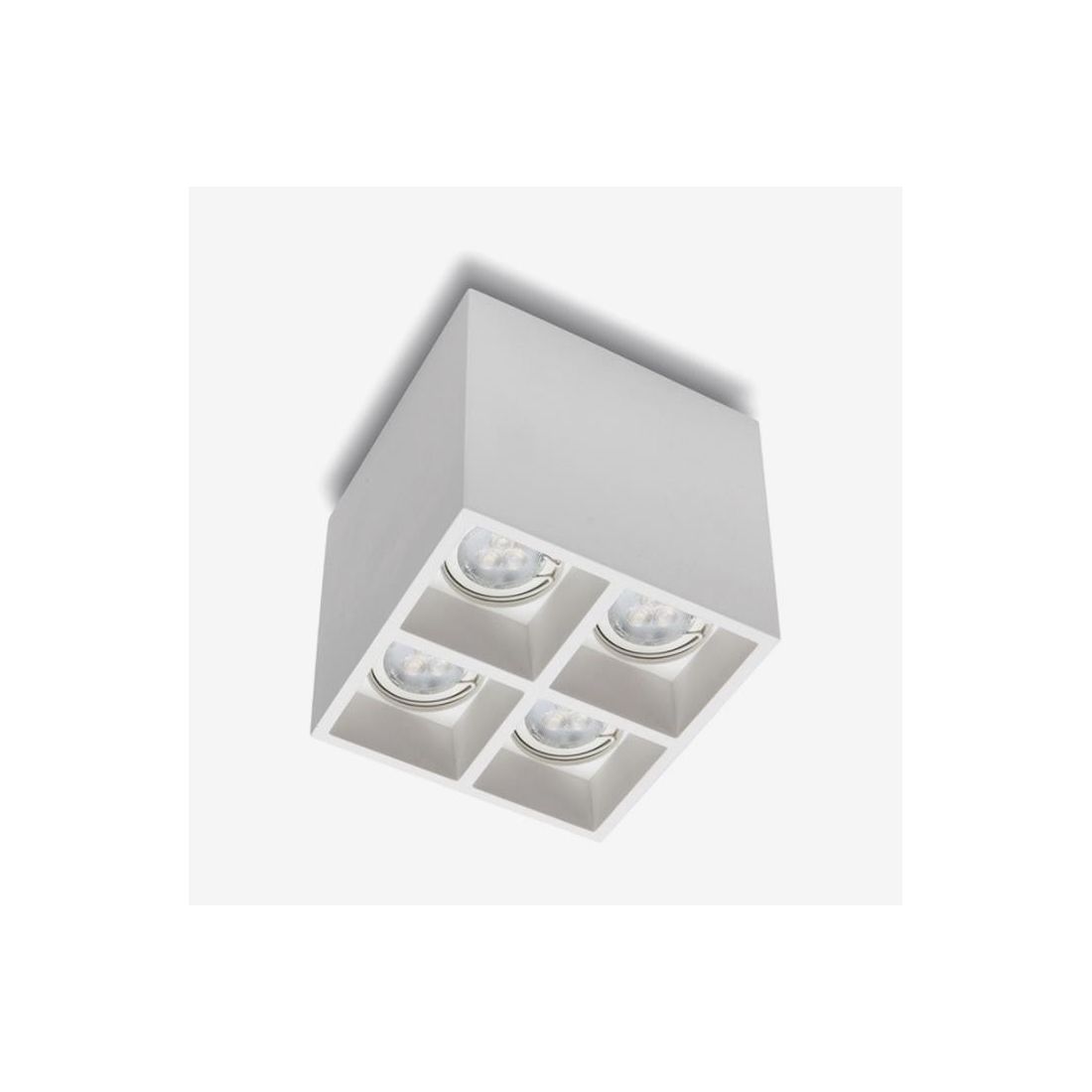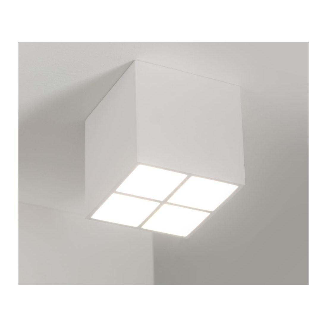 Plafoniera con un design moderno, che si presenta con la struttura a cubo cm 10.5x10.5, realizzata in Cristaly *, verniciabile a piacimento con un normalissimo colore di pittura, al cui interno sono posizionati quattro faretti installati singolarmente in appositi spazi; la luce fuoriesce dalla parte inferiore della plafoniera e risulta adattabile a qualsiasi tipo di necessità.