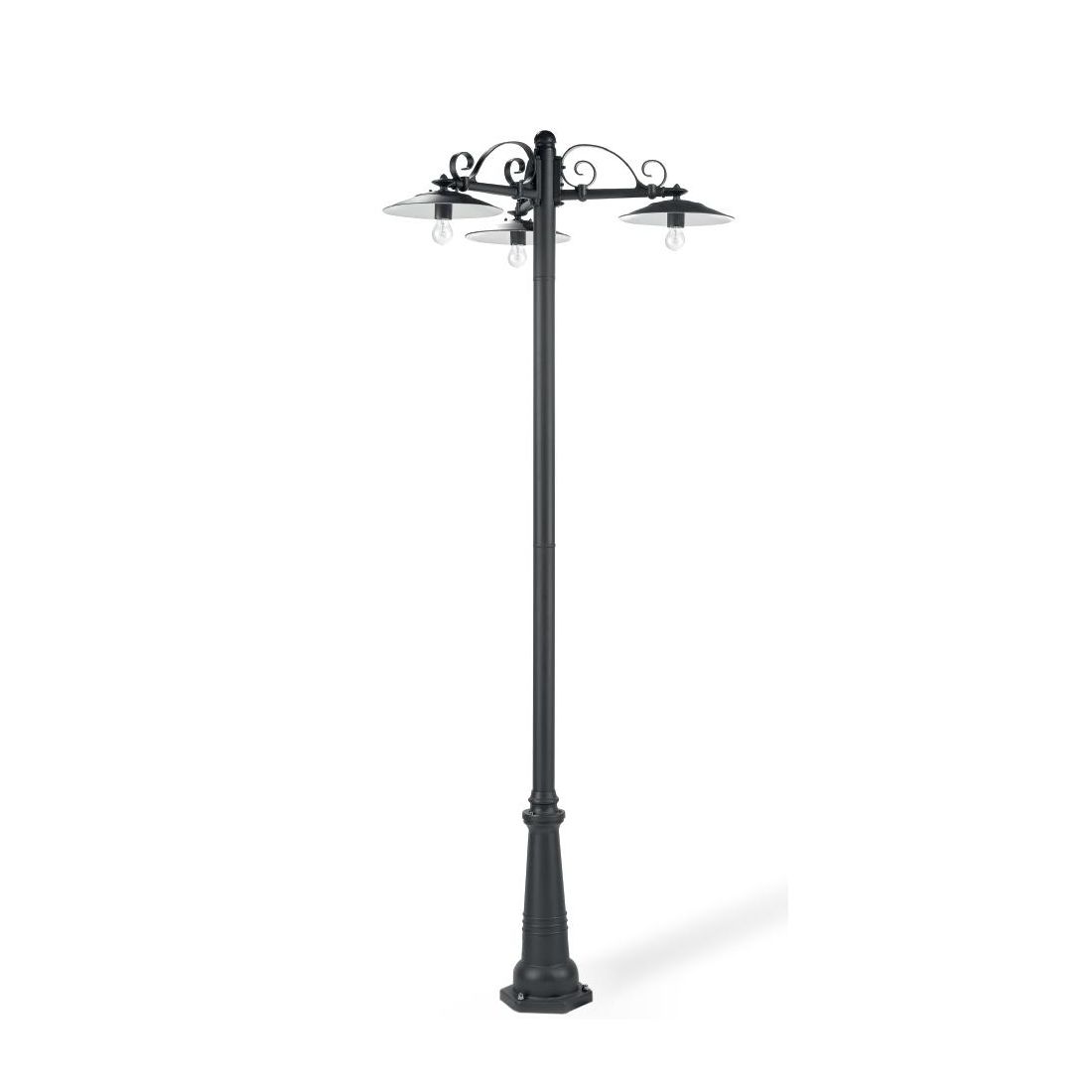 Lampione classico da esterni a tre luci, con bracci e struttura realizzati in alluminio pressofuso verniciato a polveri nel colore Antracite con piatti smaltati di bianco al loro interno; trattamento anticorrosivo con verniciatura a polveri epossidiche, con dispositivo di connessione e triangolo di fissaggio a terra inclusi.