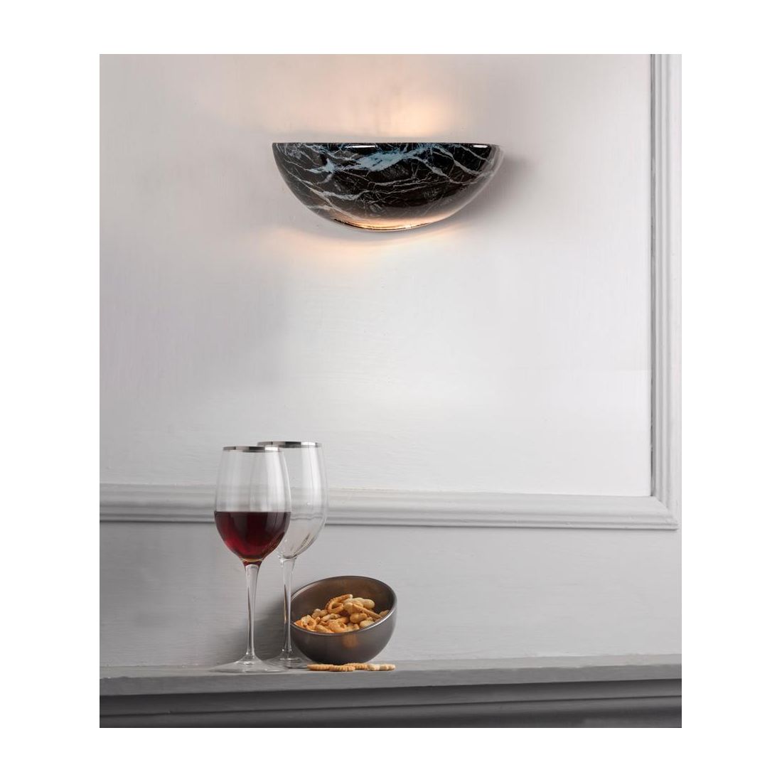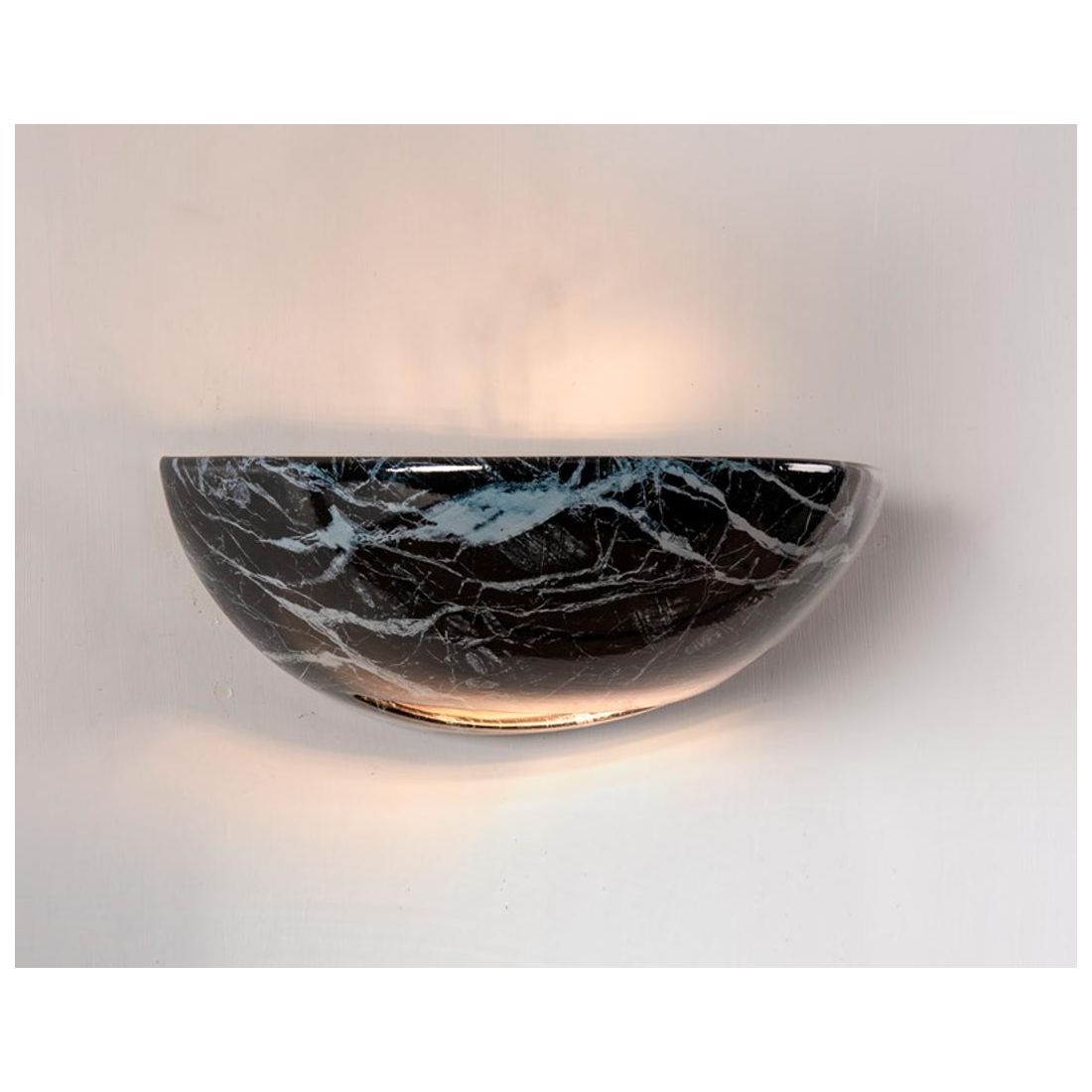Lampada da parete realizzata in terracotta decorata con effetto marmo di colore Nero, prodotto a mano in Italia dal produttore IMAS, a forma di vaschetta con fessura sul basso, che diffonde una luce indiretta sulla parete sia verso l'alto (per circa un 90%) sia verso il basso (per circa il 10%).