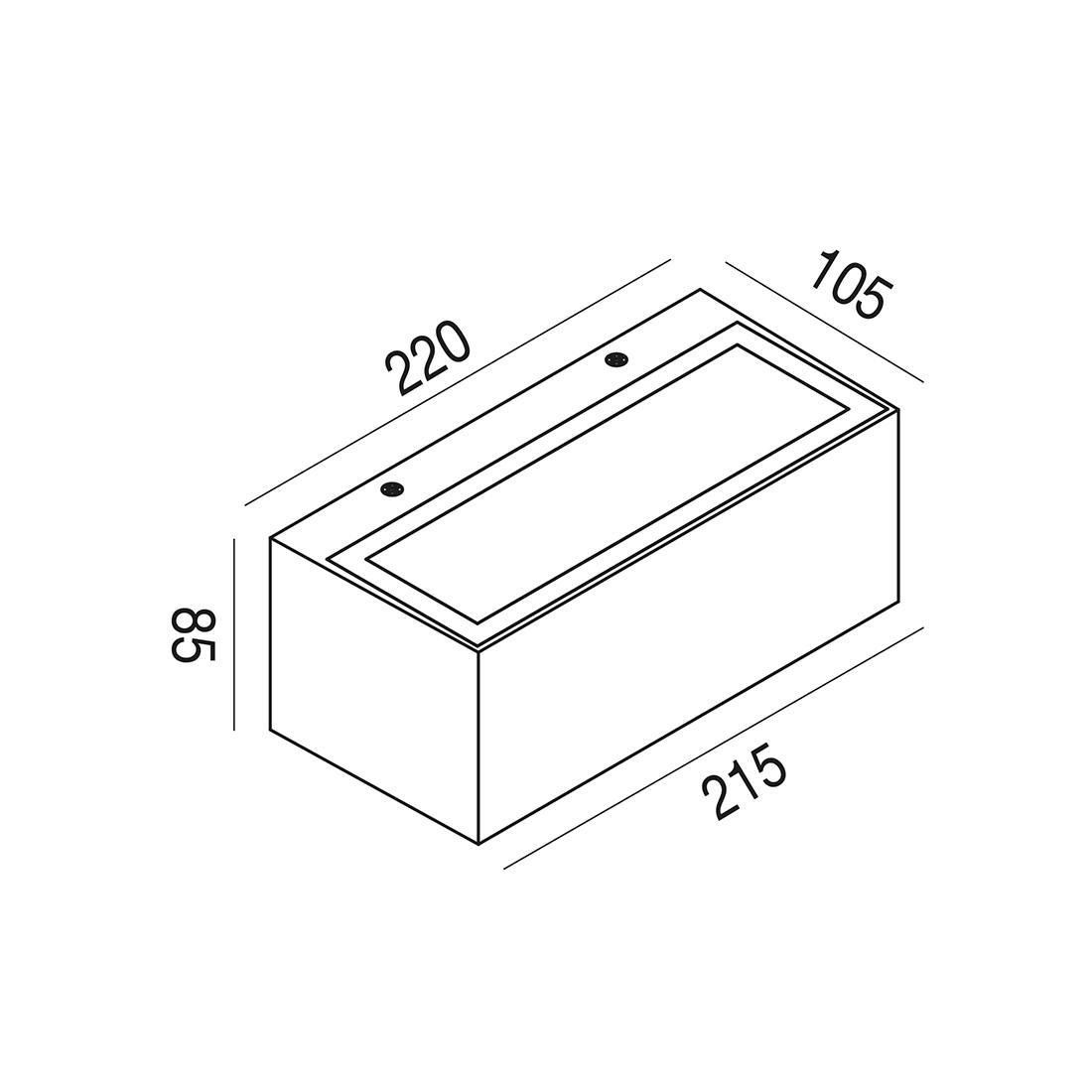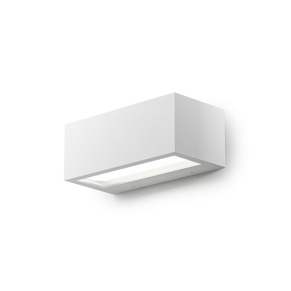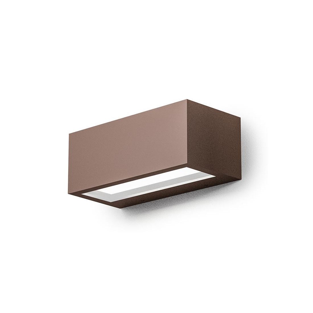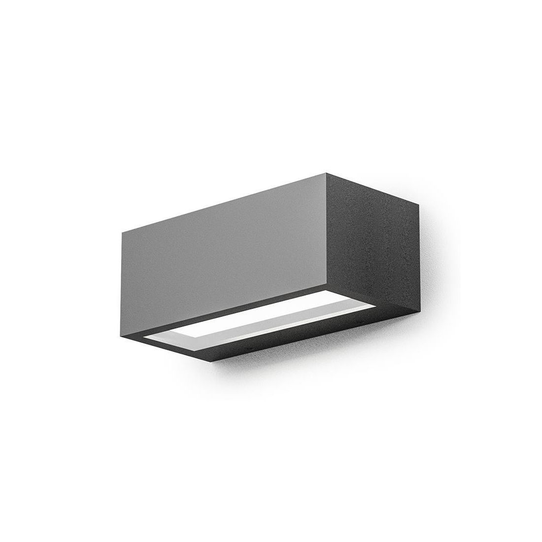 Applique biemissione della Gea Luce, con una forma rettangolare, realizzato interamente in alluminio pressofuso con il diffusore in vetro trasparente che emette un doppio fascio di luce indiretto sia verso il basso che verso l'alto; disponibile in 3 diverse finiture colore a scelta tra Bianco, Antracite oppure Ruggine.