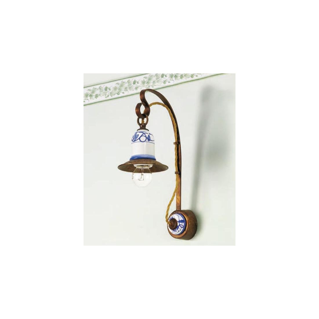 Applique lampada da parete in stile rustico, con base a muro, braccio e piattino prodotti in ottone invecchiato e con particolari in terracotta decorata a mano con decoro Iris Blu.