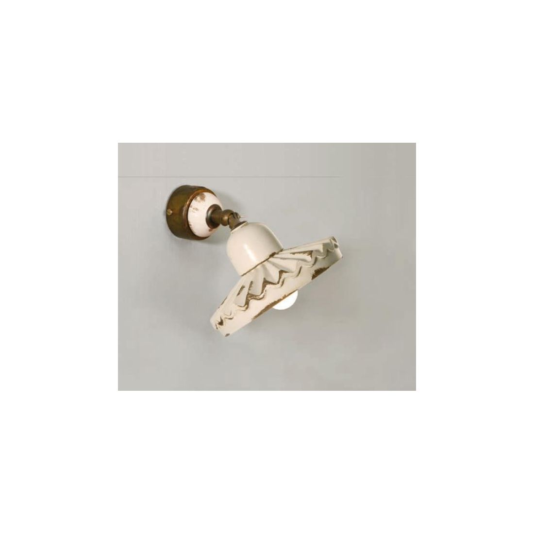 Applique/spot in perfetto stile rustico e country, con diffusore a forma di piatto del diametro di cm 20 con una lavorazione plissettata realizzato in ceramica decorata a mano con decoro Bianco Pepe, con base a muro e snodo in ottone invecchiato che permette di orientare il punto luce dove più si desidera.