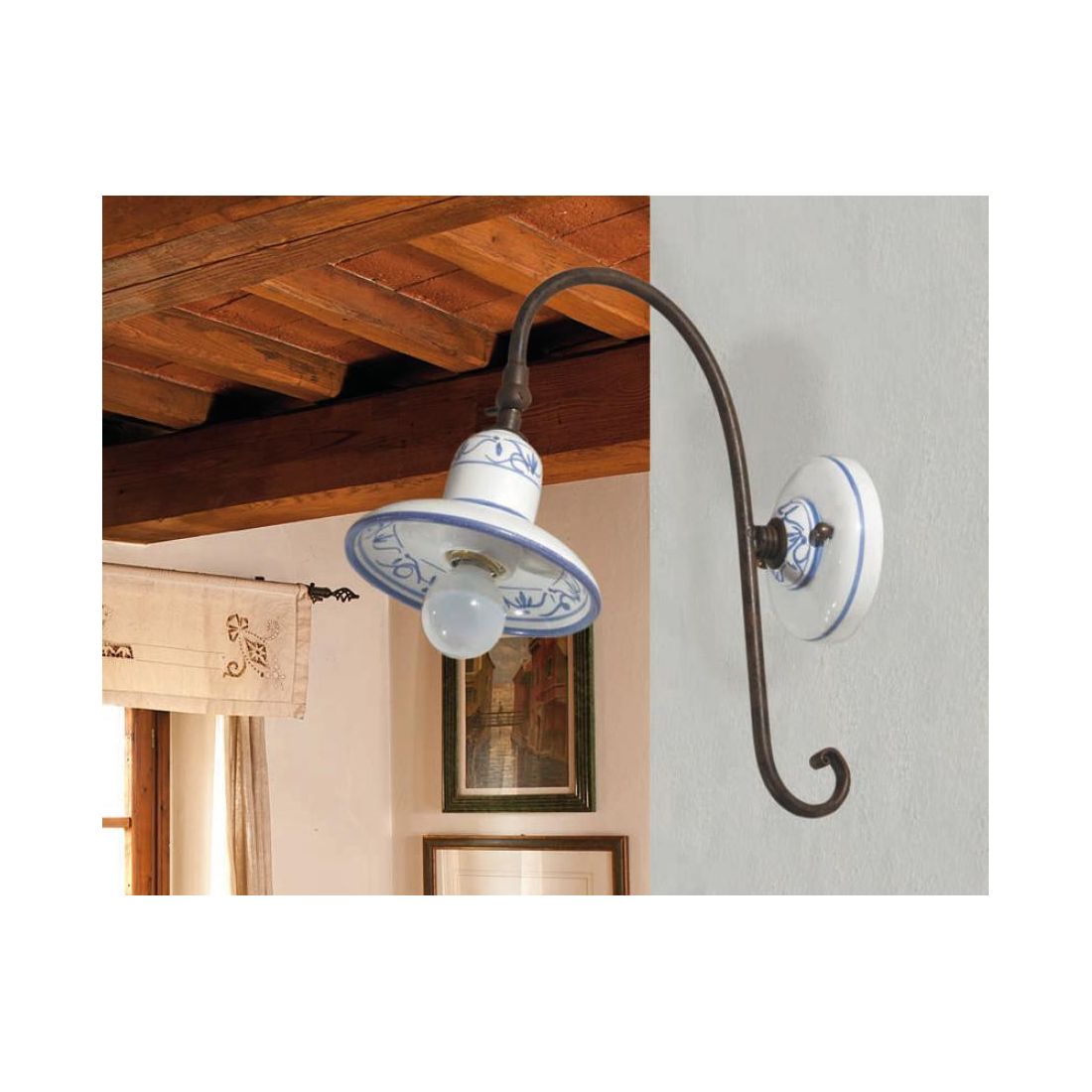 Applique in perfetto stile rustico realizzata in ceramica decorata a mano con decoro Iris Blu, con imponente braccio con ricciolo finale e con snodo in ferro verniciato ruggine che permette di orientare il punto luce dove più si desidera.