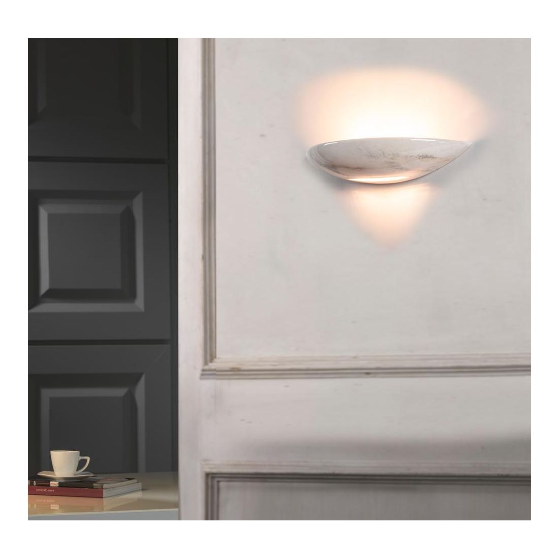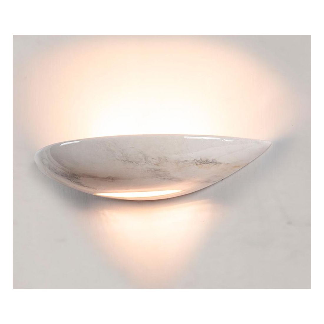 Lampada da parete con la forma a vaschetta realizzata a mano in Italia dal produttore IMAS, prodotta in ceramica con un decoro marmo bianco di Carrara, con fessura sul basso che diffonde una luce indiretta sulla parete sia verso l'alto (per circa un 90%) sia verso il basso (per circa il 10%).