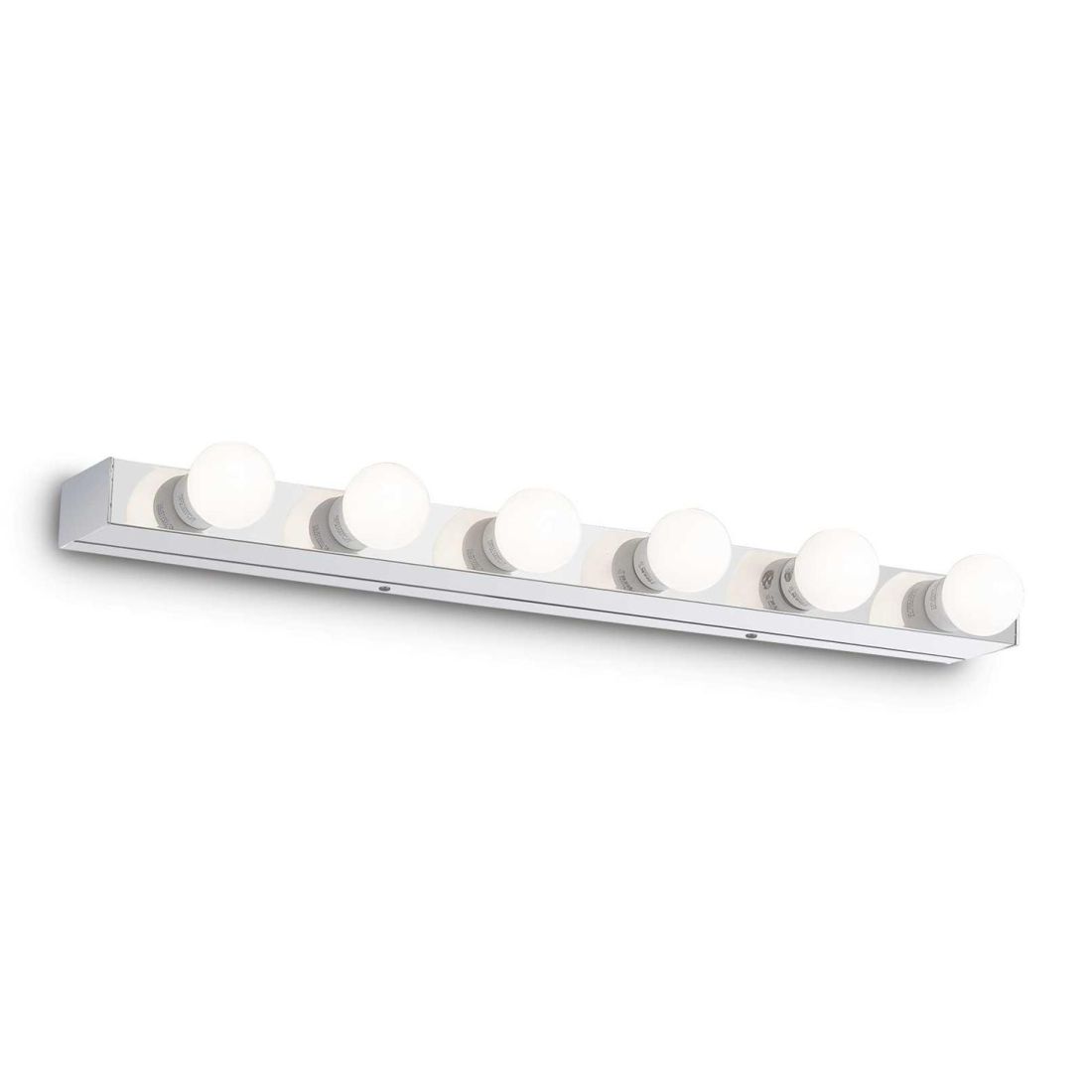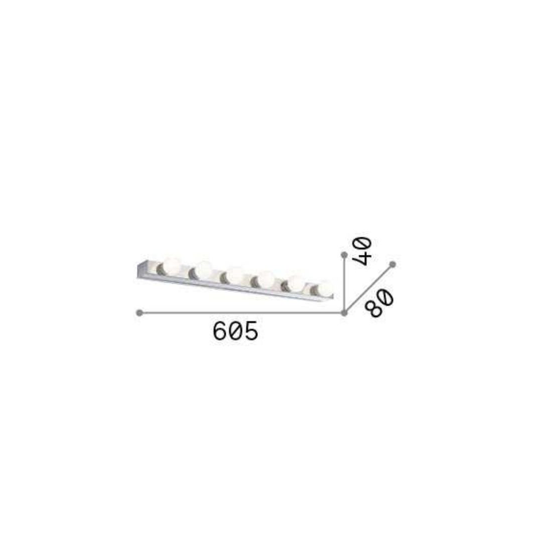 Applique in metallo in vari colori bianco, cromo, ottone o nero (a vostra scelta) adatto per uno specchio di un bagno sia montato sopra oppure montati lateralmente. Un applique essenziale dove le lampadine rimangono a vista e possono essere scelte tra la vasta gamma con attacco E14 a Led a proprio gusto personale, acquistabili separatamente. Dotato di 6 lampadine risulta essere molto luminoso sia per illluminarsi che per illuminare il proprio bagno.