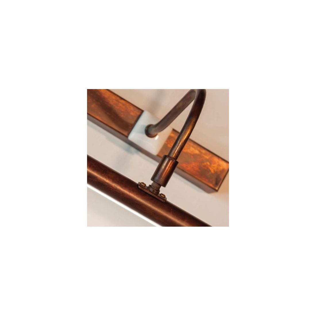 Lampada da parete in stile rustico, adatta per sopra lo specchio o sopra ad un quadro, realizzata in ottone invecchiato con particolari in ceramica Bianco lucido della lunghezza di cm 50.