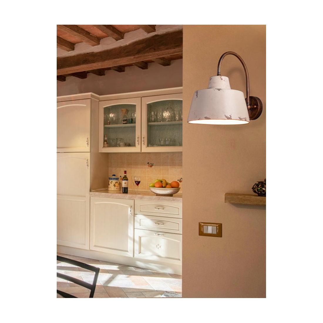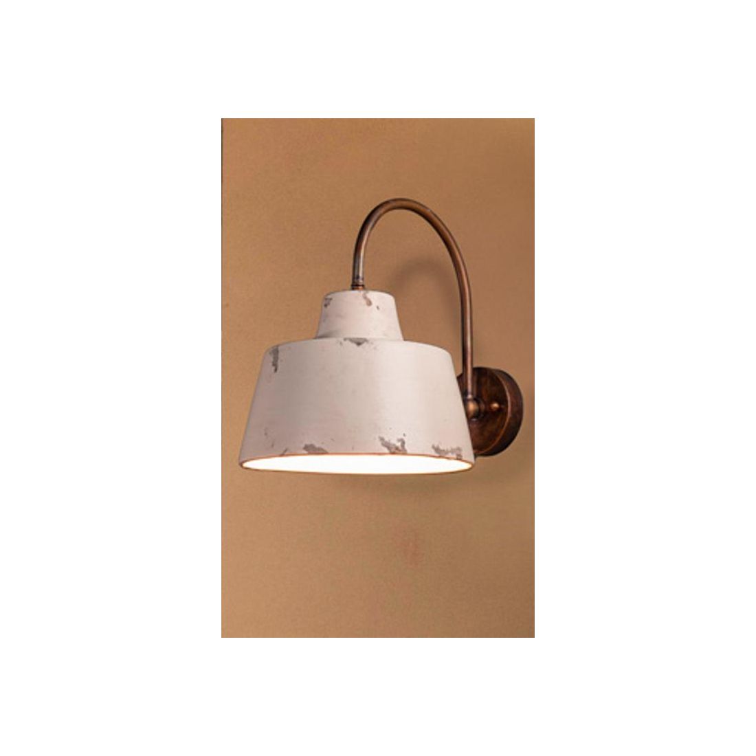 Lampada da parete in stile rustico che si presenta con una struttura a braccio curvo realizzata in Ottone anticato e con un diffusore realizzato in ceramica con decoro Bianco sabbia, ideale per l'illuminazione di salotti, ingressi, corridoi, camere da letto, taverne oppure per lo studio.