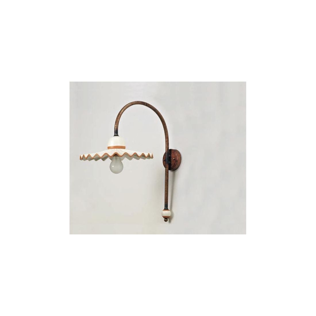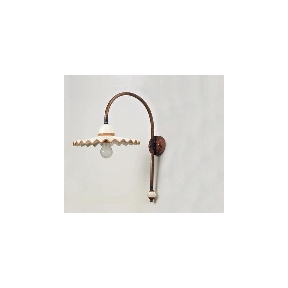 Applique in perfetto stile rustico con un imponente braccio curvo in ottone invecchiato completato e rifinito da un piatto plissettato realizzato a mano in ceramica con decoro Bordo cotto.