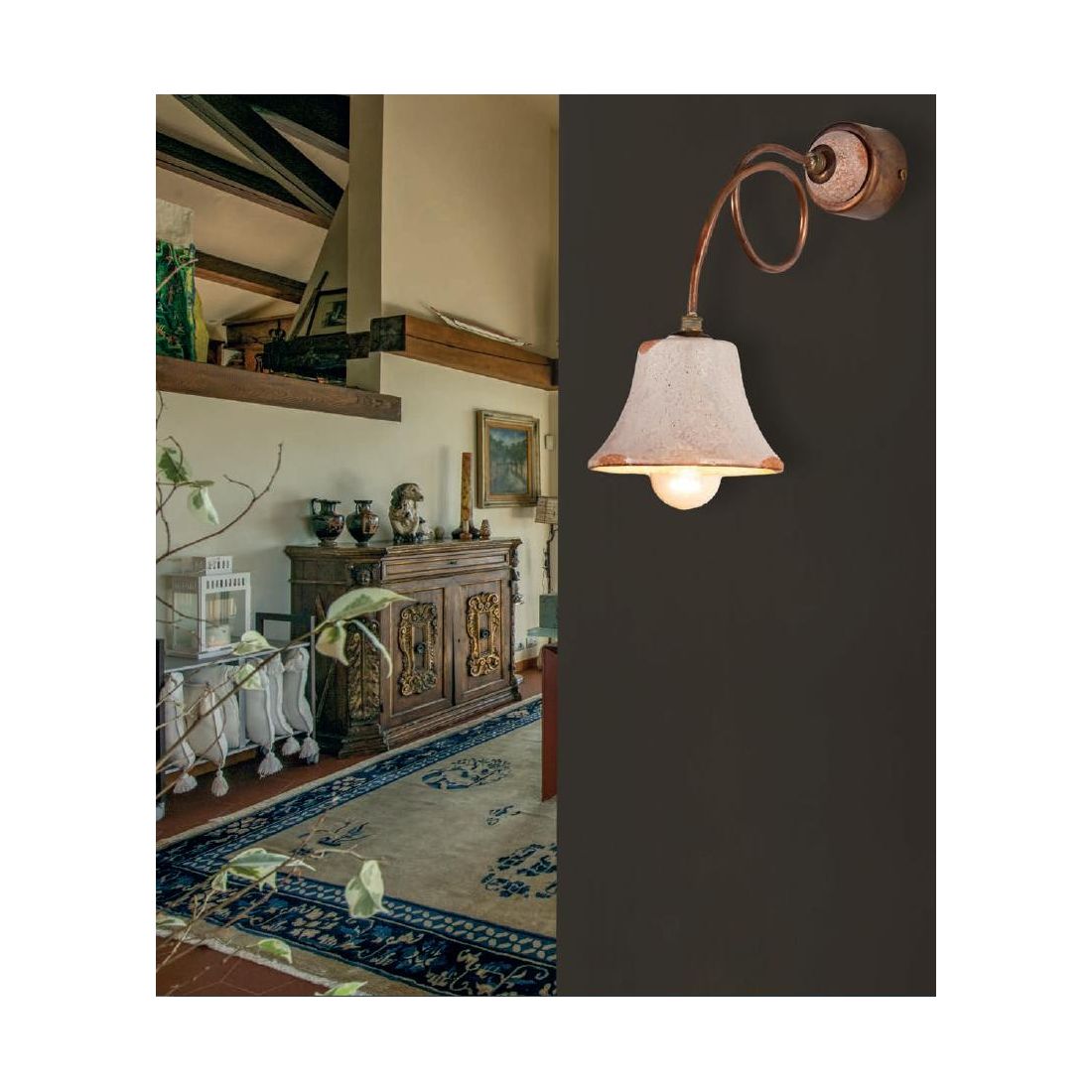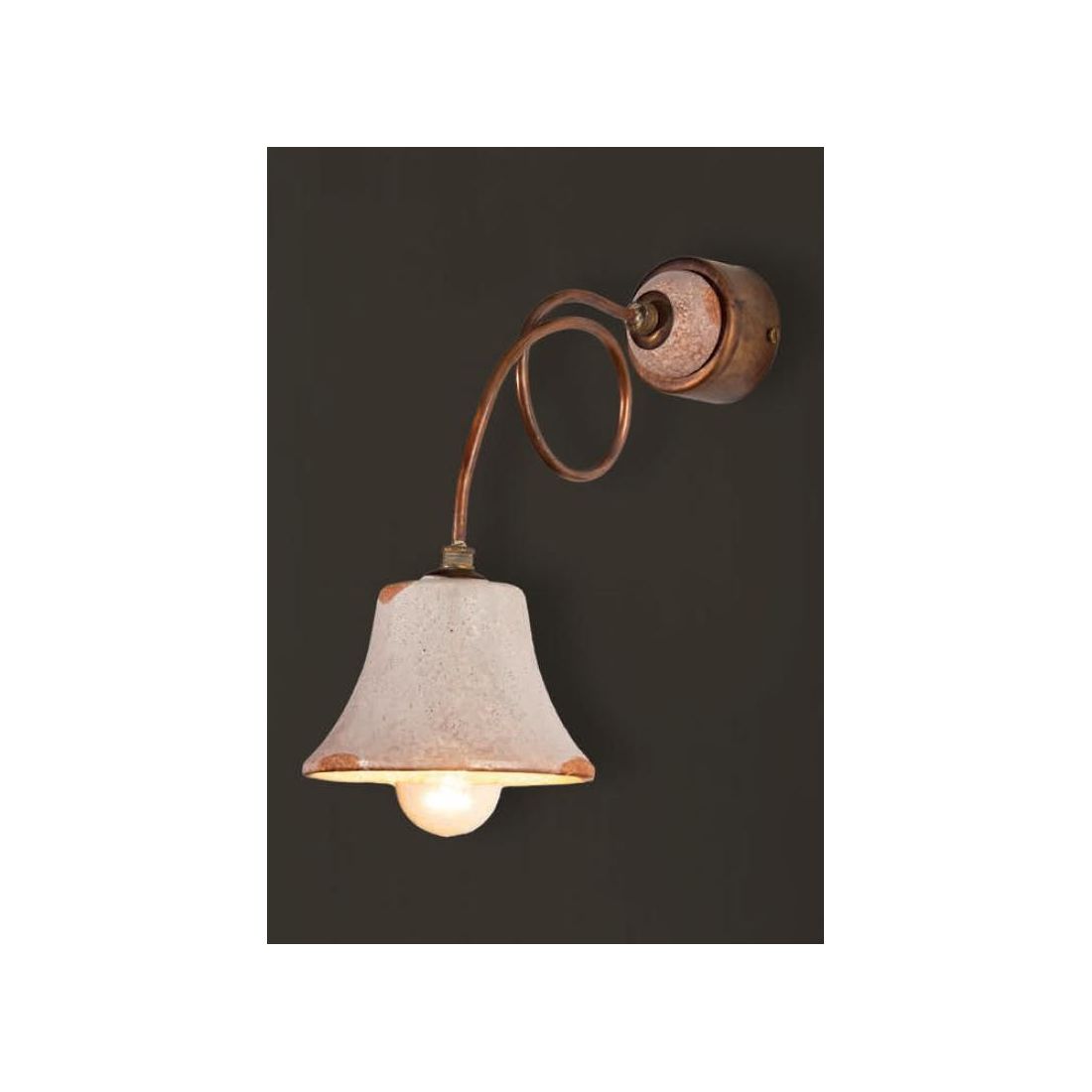 Applique dallo stile rustico che si presenta con un braccio semi rigido realizzato in rame e con diffusore a campana prodotta in ceramica con decoro etrusco bianco pepe su fondo rosso tegola, così come il particolare inserito sulla base a muro.