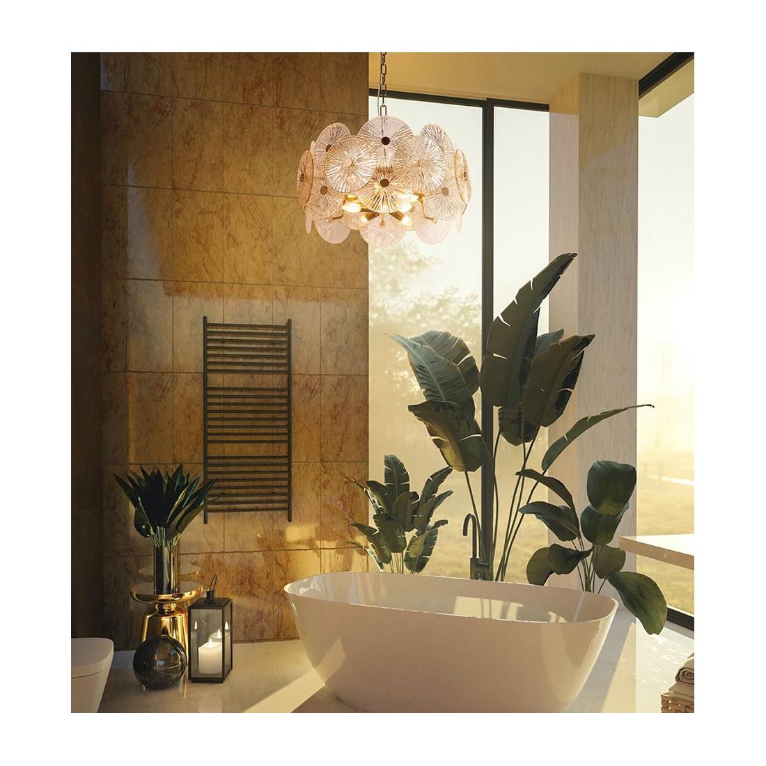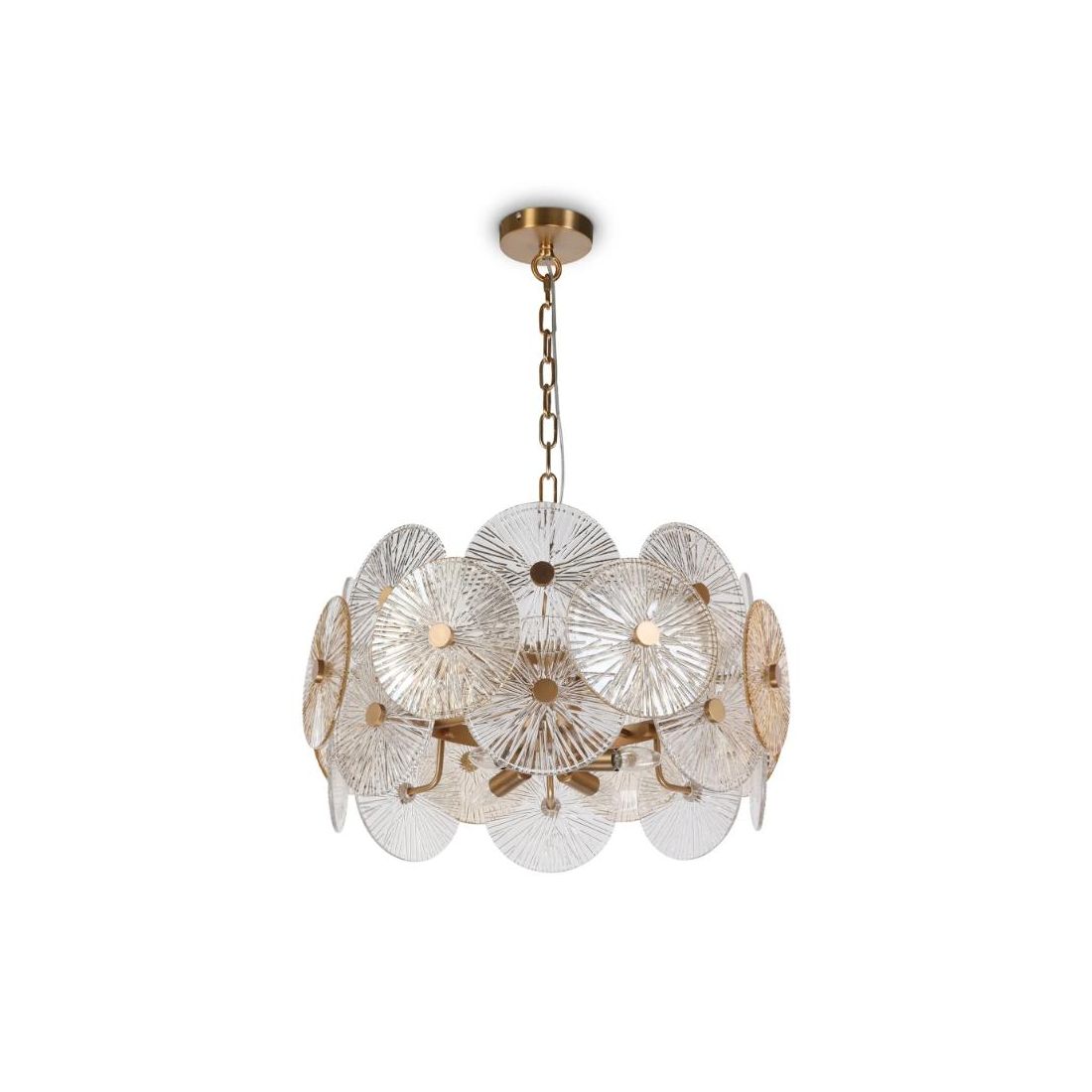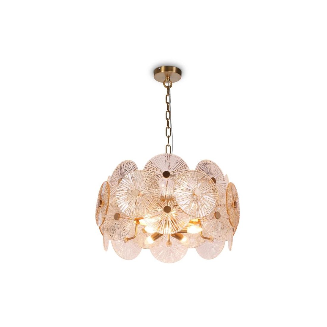 Lampadario a sospensione con un diametro di cm 62.6, dallo stile classico, che si presenta con la montatura in metallo finitura Oro e con il diffusore formato da dischi realizzati in vetro goffrato stampato con sfumature ambrate e trasparenti nel decoro. L'altezza del lampadario è regolabile in modo da poter posizione il corpo illuminante all'altezza da voi più desiderata in base alle vostre esigenze.