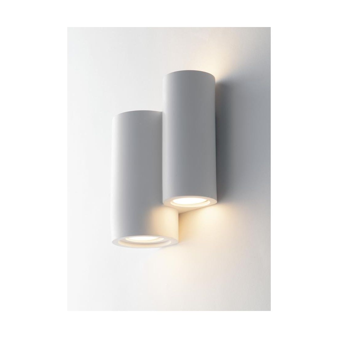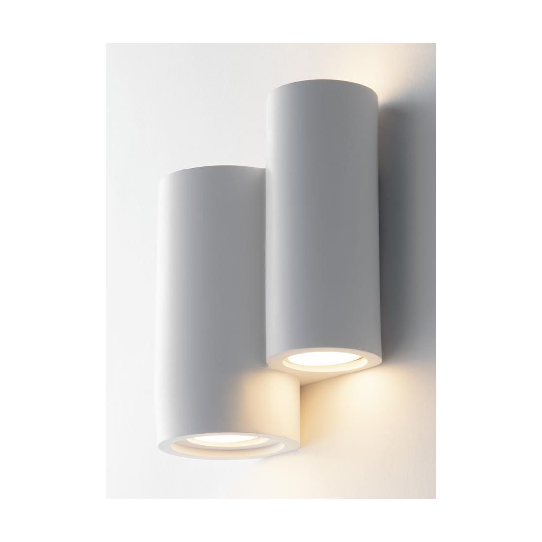 Applique dal design moderno composta da due elementi dalla forma cilindrica disposti su due altezze diverse realizzata in gesso bianco verniciabile che può essere personalizzata facilmente utilizzando una normale pittura per adattarsi al meglio al tuo ambiente e che offre un'illuminazione versatile ideale per diffondere una luce uniforme e piacevole con una doppia emissione di luce sia verso l'alto che verso il basso.