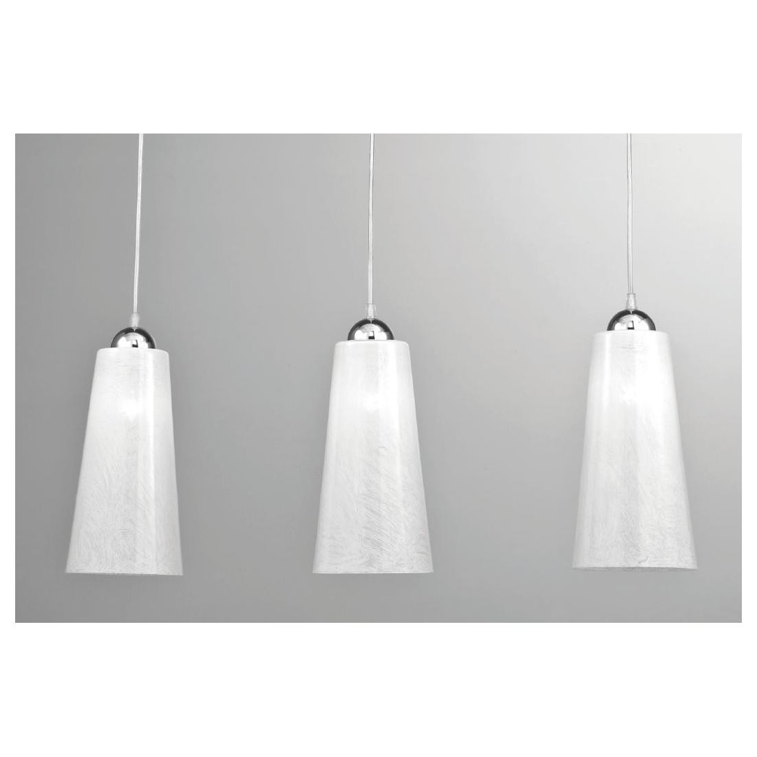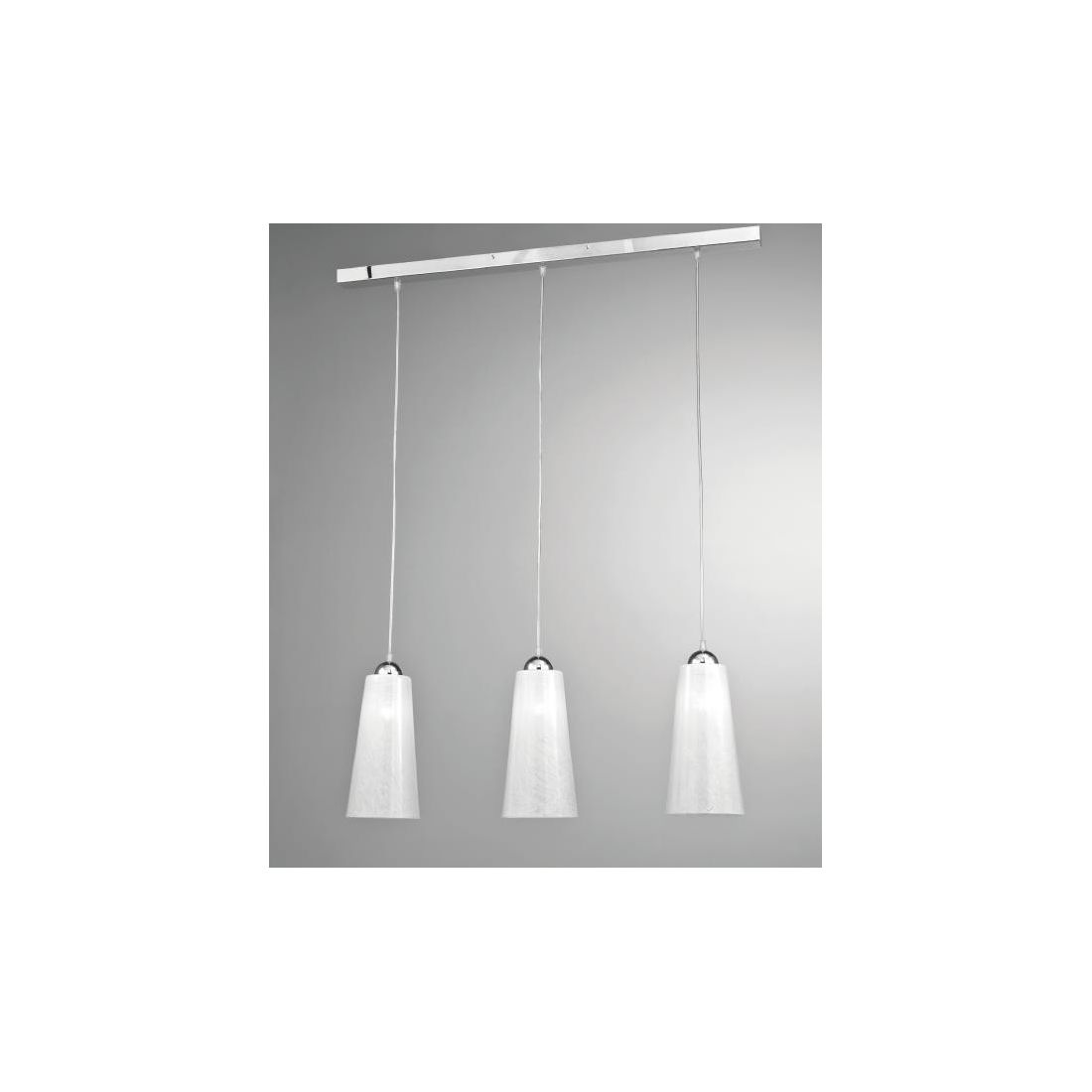 Sospensione lineare a tre luci composta da una struttura rettangolare a soffitto realizzata in metallo Cromato da cui pendono i tre diffusori di forma conica prodotti in vetro decorati di bianco lucido all'interno con un effetto graffiato.