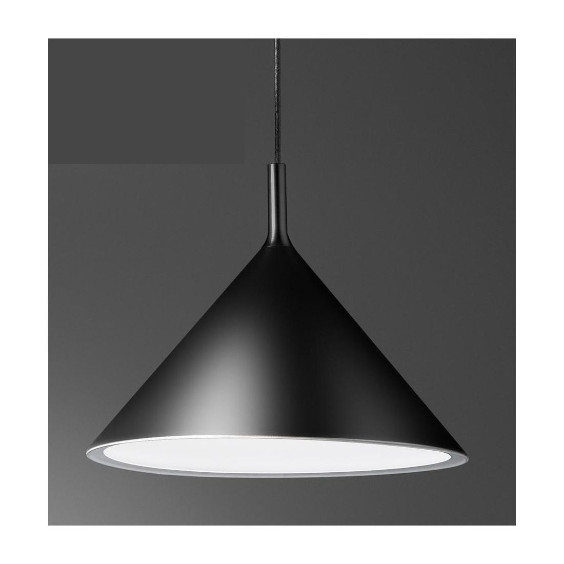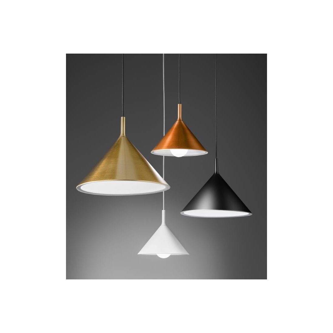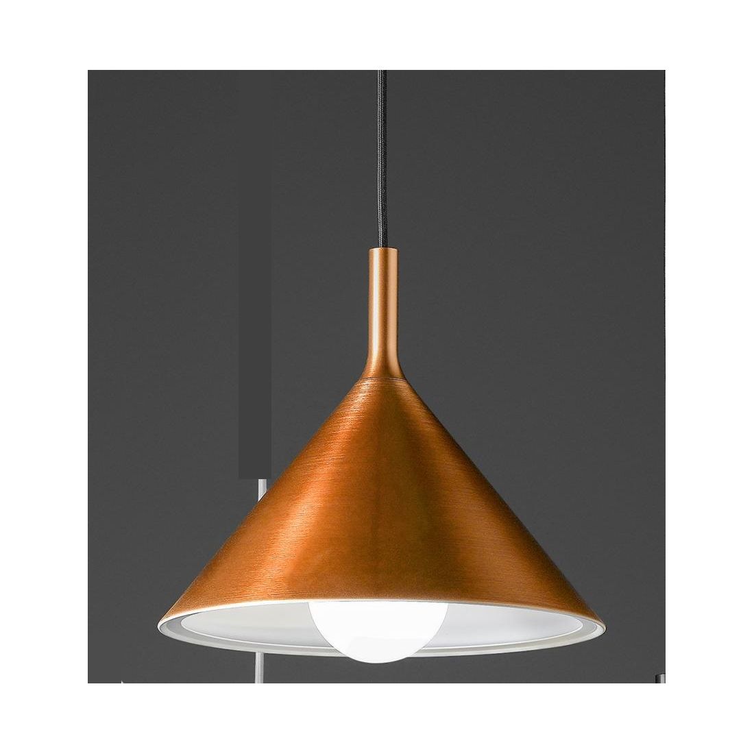Una sospensione a luce singola con il diffusore realizzato in metallo verniciato nella parte interna nel colore Bianco mentre esternamente si può avere nei colori: Nero, Bianco, Ottone oppure Rame; il diffusore ha un diametro di 30 cm che riprendere la forma di un cono rovesciato che è disponibile, qui sul nostro sito web, anche nella variante più grande del diametro di cm 40.