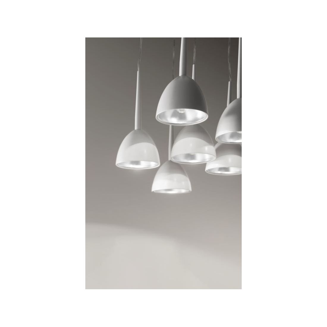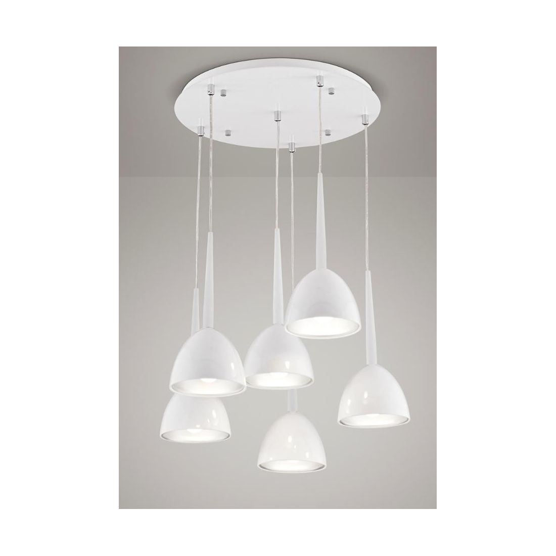 Sospensione moderna a 6 luci della serie BELL di Affralux con una struttura realizzata in metallo verniciato nel colore bianco con finitura satinata; il riflettore interno dei diffusori sono in metallo cromato con finitura sabbiata; tutti i cavetti sono regolabili in lunghezza.