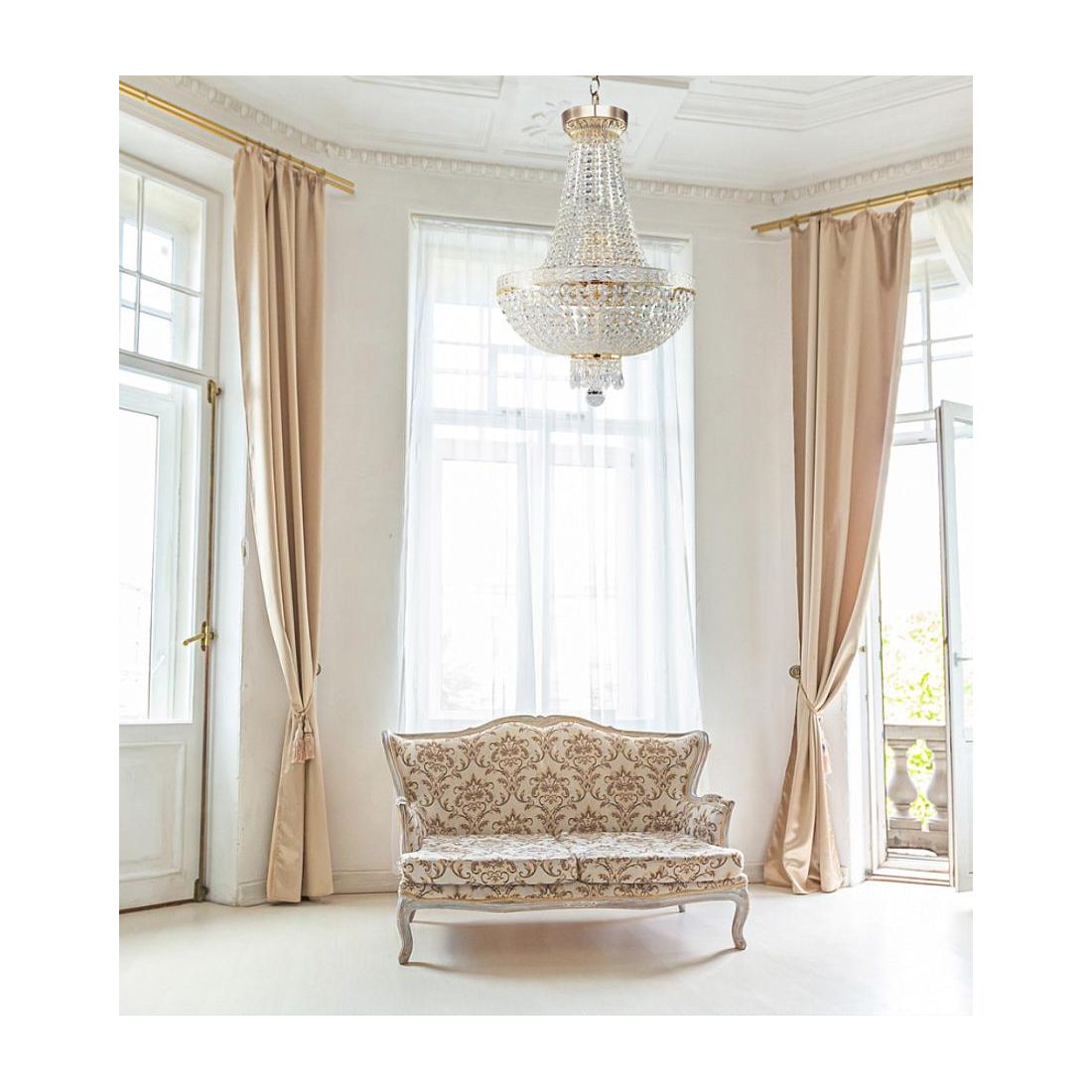 Elegante lampadario a sospensione con una struttura realizzata in metallo rifinito in colore Oro e arricchito da dettagli in rilievo con patina bianca; il diffusore, composto da cristalli trasparenti accuratamente molati in diverse dimensioni e tagli, crea suggestivi giochi di luce e riflessi che trasformano l’ambiente al momento dell’accensione.