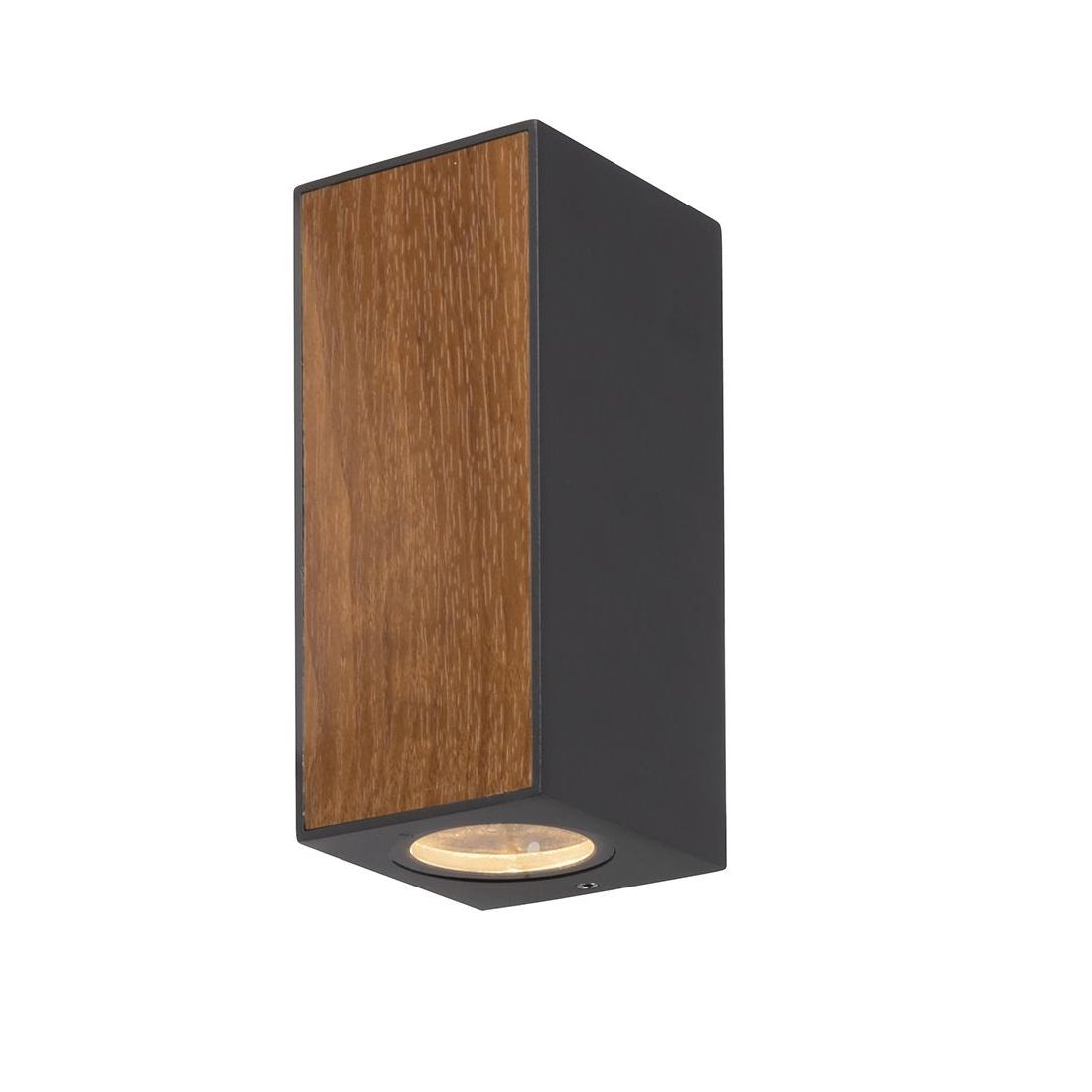 Applique ideata per ambienti esterni, con bi-emissione di luce, con una struttura a forma di parallelepipedo realizzata in alluminio con finitura Antracite che contrasta con il pannello frontale che ha una finitura Legno.