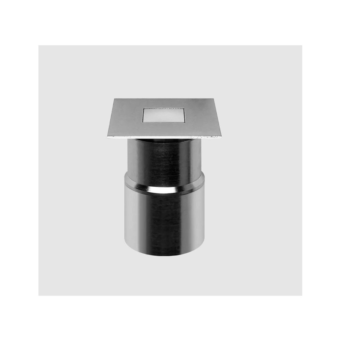 Segnapasso da incasso per ambienti esterni, con la flangia di forma quadrata, che viene realizzato in acciaio inossidabile con una finitura di colore Acciaio, ottenuta tramite pallinatura, ideale per valorizzare e rendere più sicuri elementi architettonici esterni come gradinate, scalini, aree di transito, porticati, logge, terrazze e balconi.