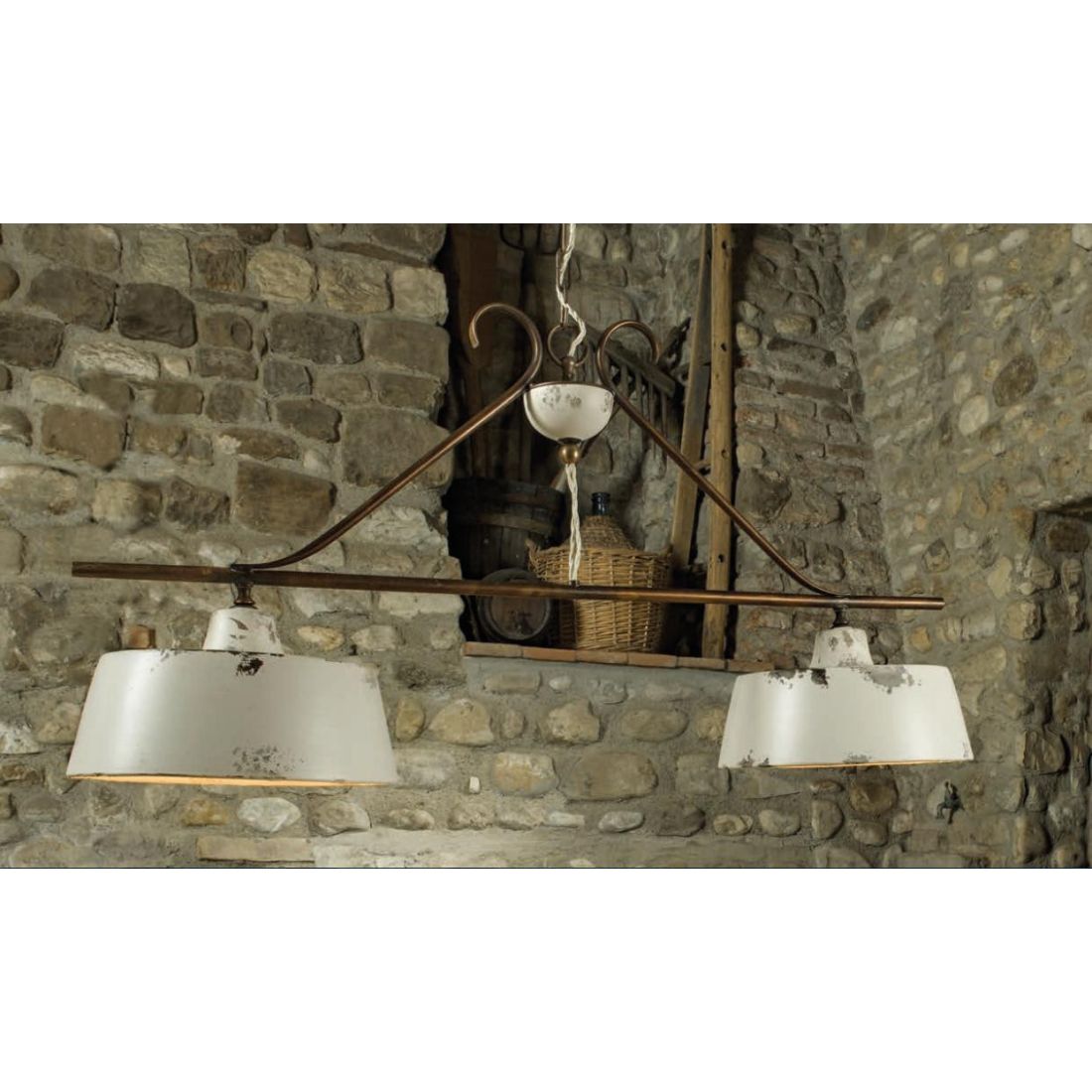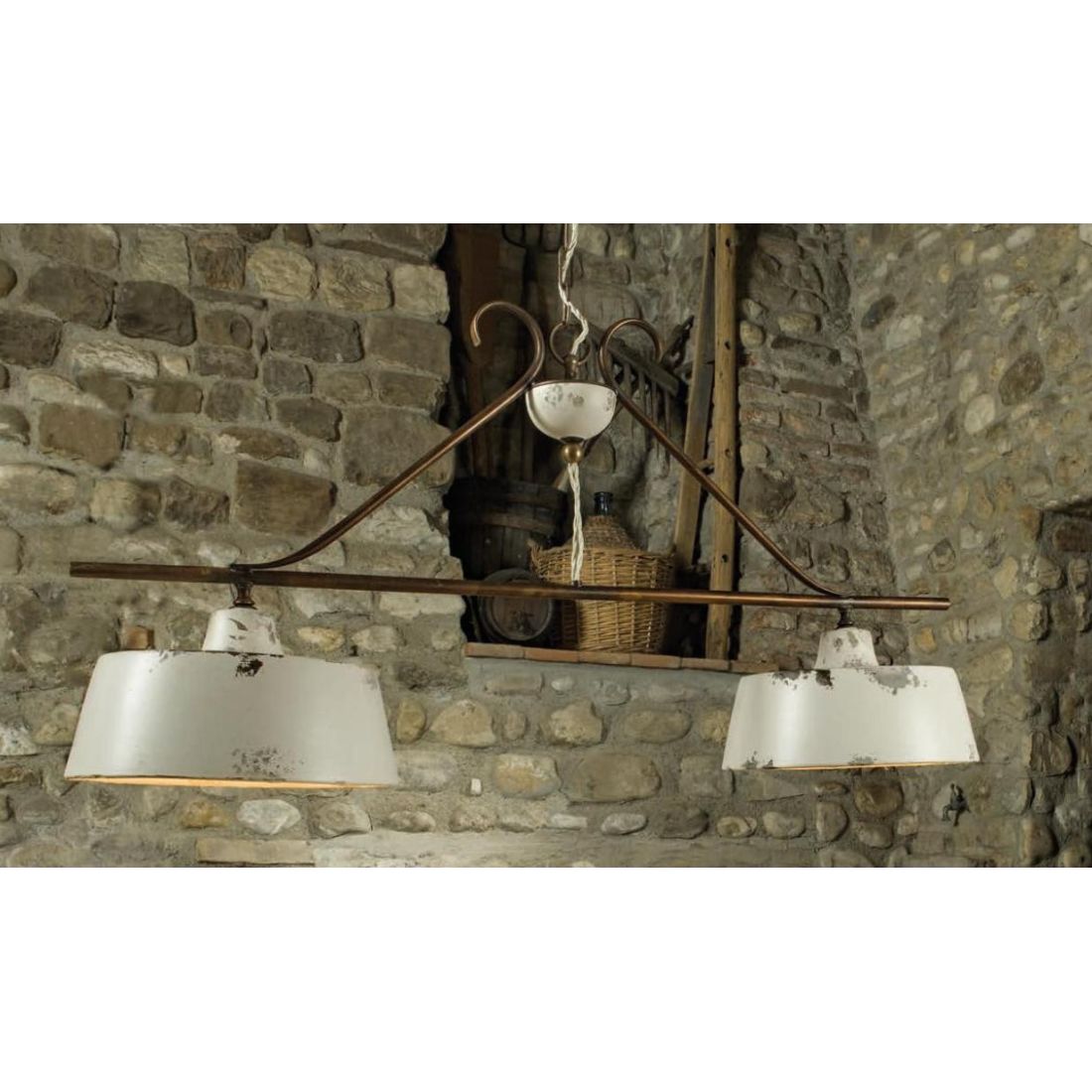 Un lampadario Made in Italy, prodotta dalla Imas Firenze, ideale per l'illuminazione di ambienti rustici o country come salotti, soggiorni, cucine o taverne; dotato di due portalampada ciascuno con attacco E27 dove è possibile inserire le nuove Lampadine Led a basso consumo energetico del colore e dell'intensità che più vi necessita.