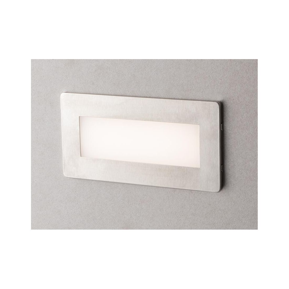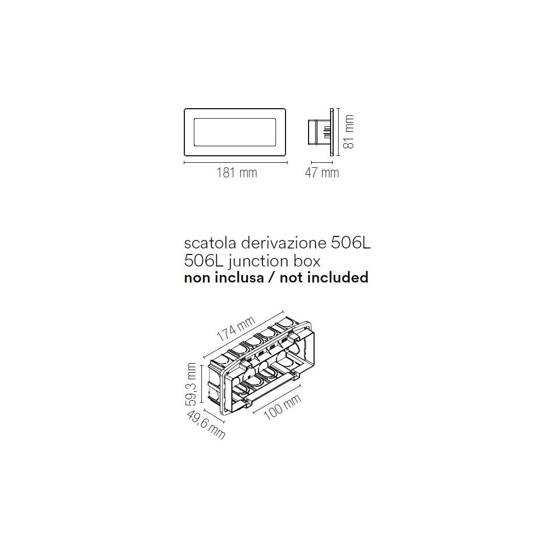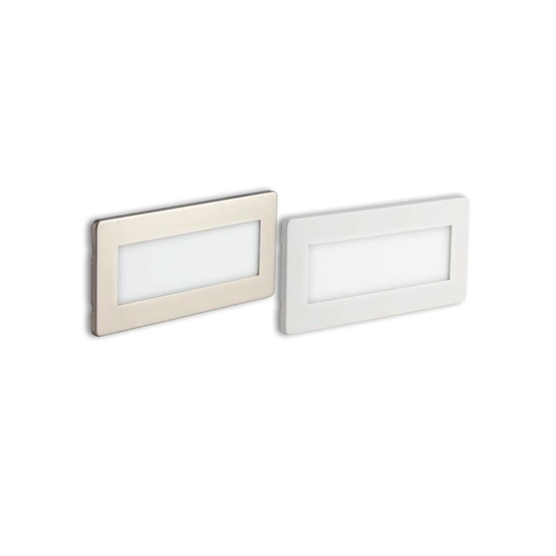 Segnapasso da incasso di forma rettangolare che si presenta con una struttura in policarbonato con doppia placchetta frontale intercambiabile in acciaio con finiture Nickel e Bianco. Prodotto compatibile con scatole di derivazione standard 506L (non incluse) per un montaggio semplice e veloce senza necessità di interventi strutturali complessi; una volta montata risulterà quasi a filo con il muro occupando pochissimo spazio.