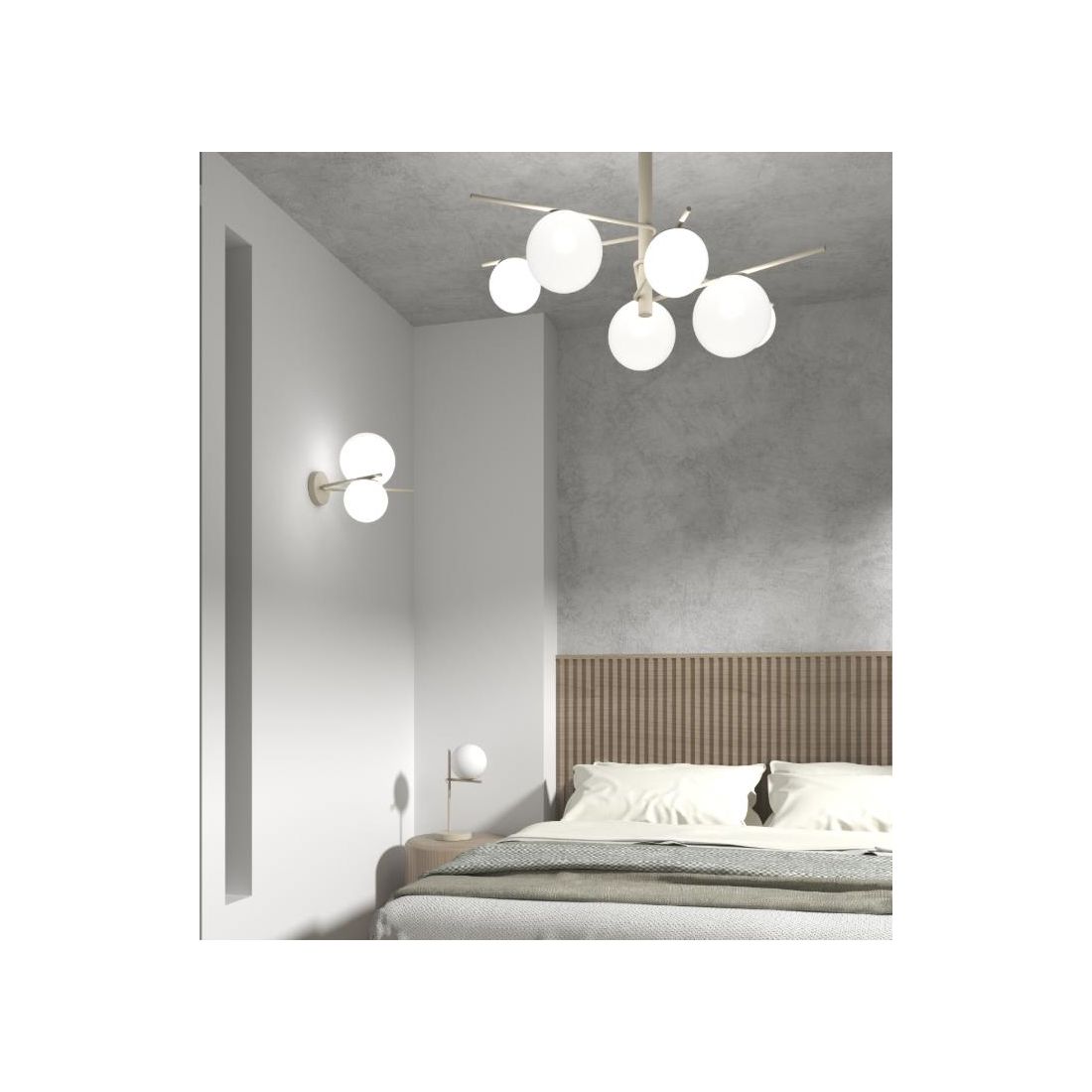 BOOMERANG SOSPENSIONE 6 LUCI IN METALLO SABBIA E DIFFUSORI IN VETRO BIANCO LAMPADINE...