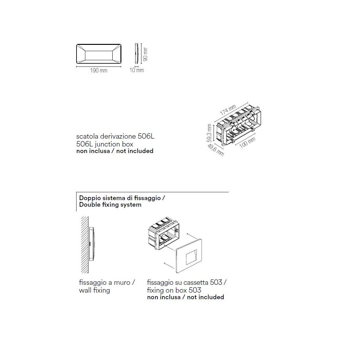 Il prodotto è compatibile con scatole di derivazione standard 506L (non incluse) per un montaggio semplice e veloce senza necessità di interventi strutturali complessi; il fascio luminoso diretto verso il basso è progettato per illuminare senza abbagliare migliorando così la visibilità e la sicurezza di scale, percorsi pedonali e gradini.