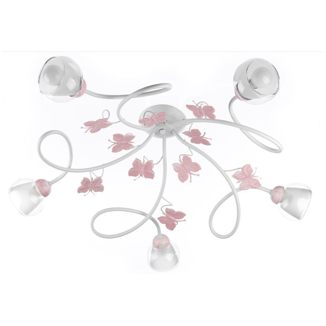 Plafoniera con 5 luci, dalle linee morbide e design moderno, che si presenta con una struttura a bracci, dalle linee avvolgenti, realizzata in metallo verniciato di Bianco impreziosita da dettagli e da farfalle dipinte nel colore Rosa e con 5 paralumi realizzati in vetro, trasparente all'esterno e bianco al suo interno.
