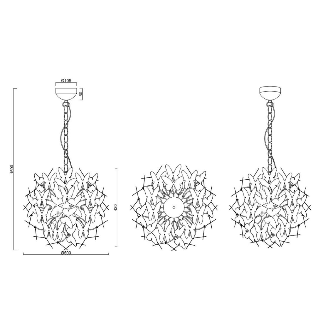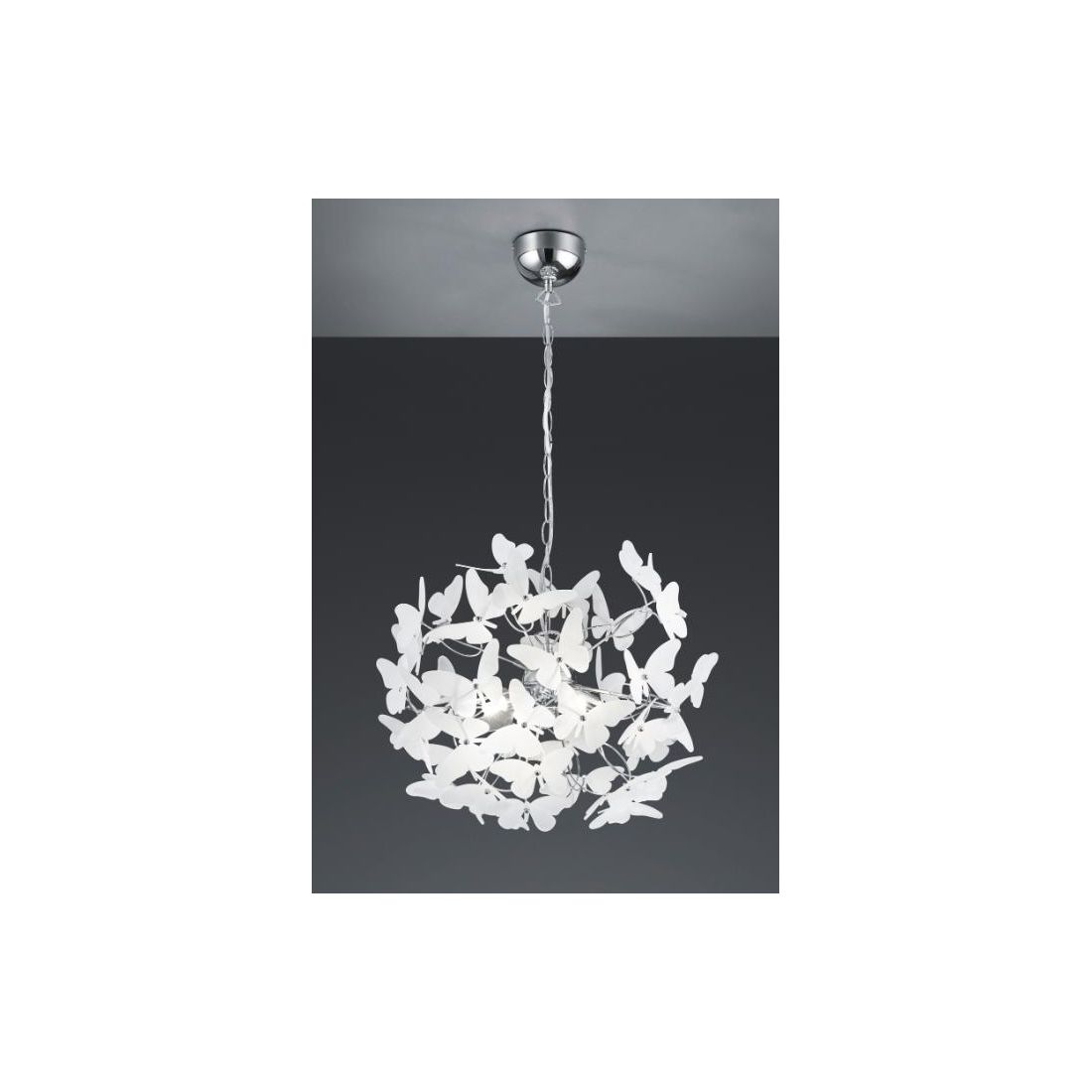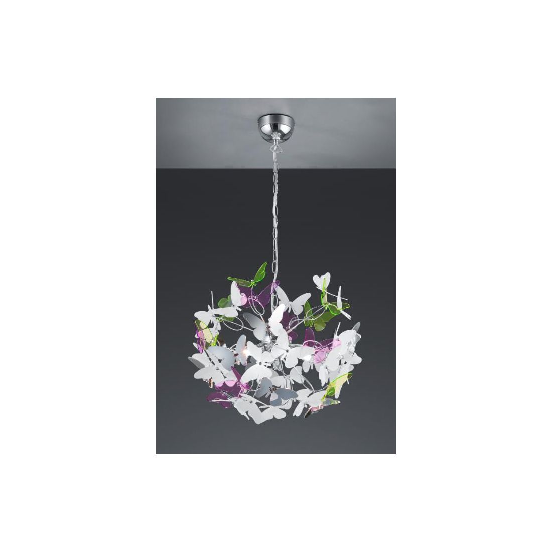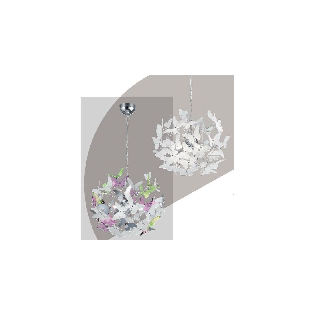 Lampadario a sospensione dal design moderno composto da rosone a soffitto in metallo cromato e da sottili bracci arcuati che terminano con molteplici farfalle realizzate in acrilico; incluse nella confezione troverete le suddette farfalline sia di colore bianco sia multicolor (verde, rosa e cromo) così che possiate costruirvi il lampadario a vostro gusto e piacimento.