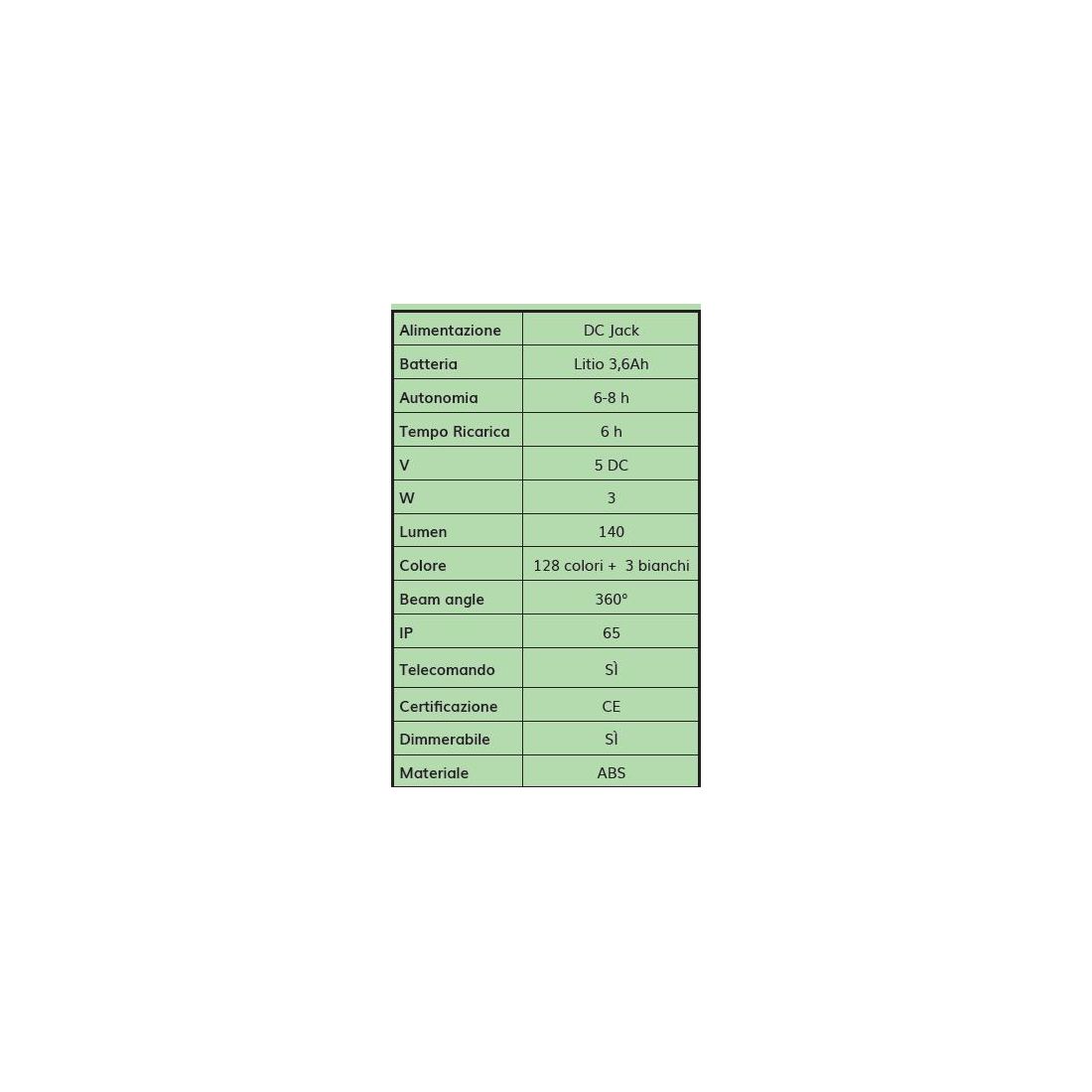 La lampada integra una sorgente luminosa a Led da 3w con resa luminosa di 140 lumen e può essere dimmerata in 128 colori, tramite telecomando in dotazione; la batteria viene ricaricata tramite cavo DC Jack ed ha un autonomia di 6-8 ore ed ha un tempo di ricarica di 6 ore.