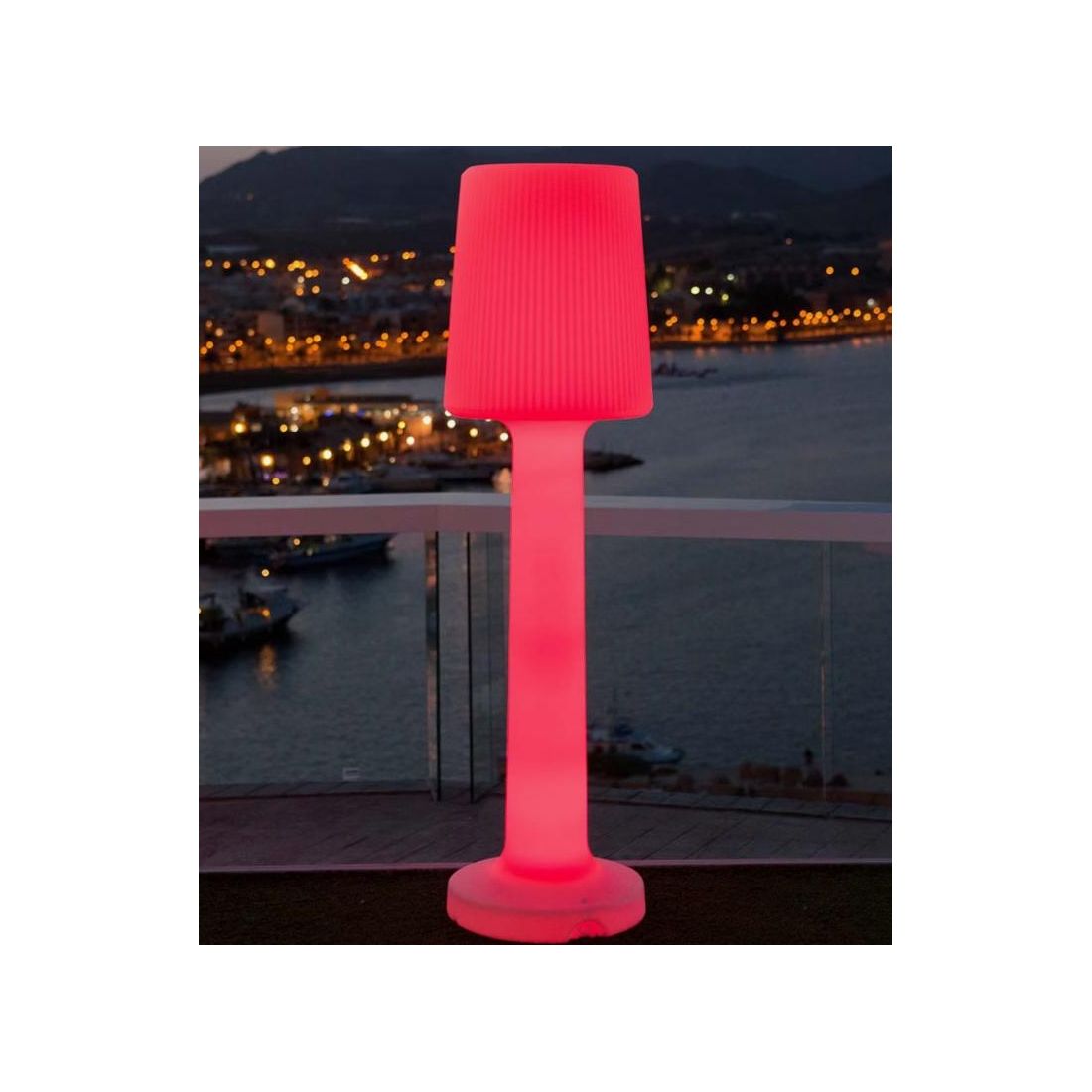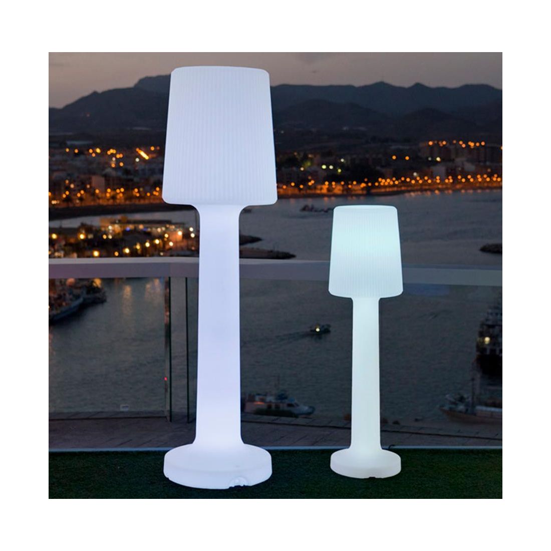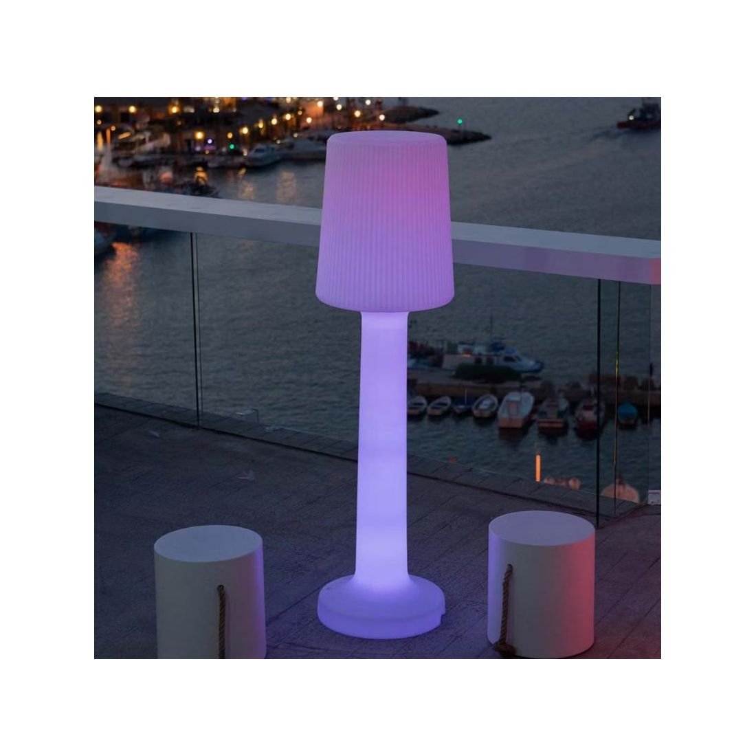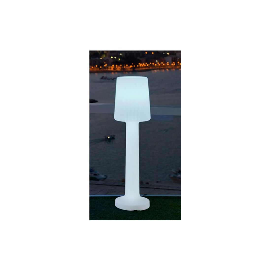 Lampada da terra ricaricabile da installare in giardino o comunque in uno spazio esterno, con un design moderno, con un altezza di cm 110, interamente realizzata in materiale plastico (ABS) di colore bianco, che può essere installata singolarmente oppure in composizioni multiple per creare scenari mozzafiato ed eleganti.