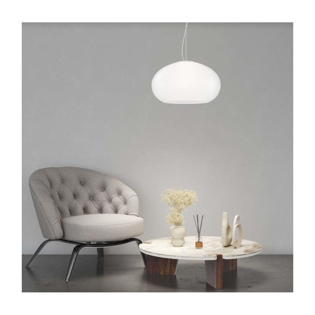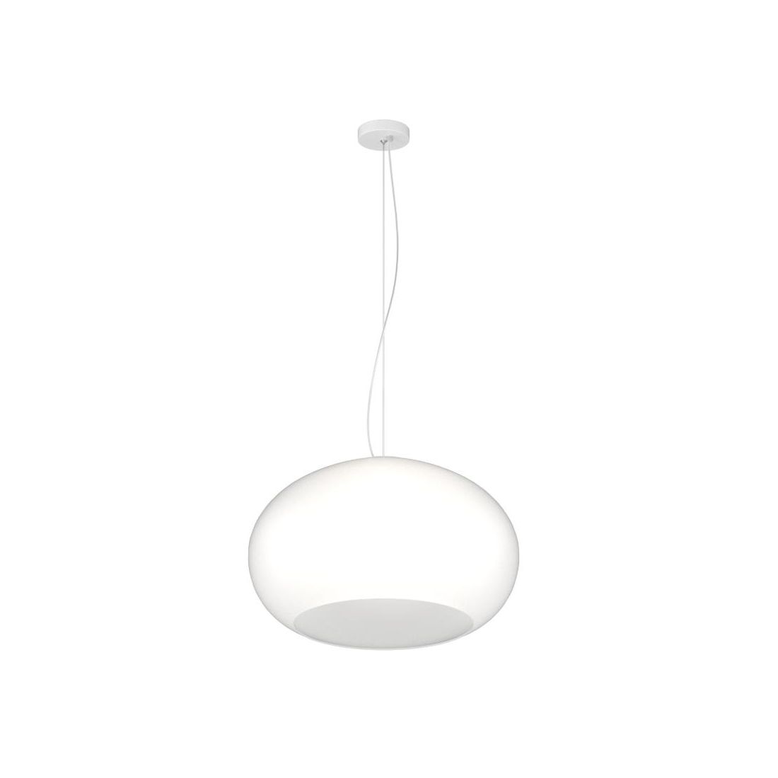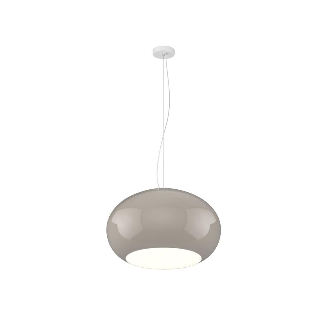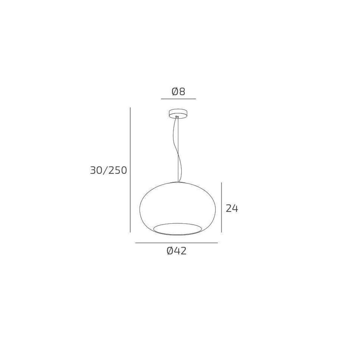 Sospensione singola, dal design elegante e attuale, con il diffusore dalla silhouette arrotondata realizzato in vetro soffiato Bianco latte acidato oppure bianco latte con una finitura Tortora lucida disponibile in due diverse misure, per adattarsi a spazi di diverse dimensioni: diametro cm 42 oppure diametro cm 55.