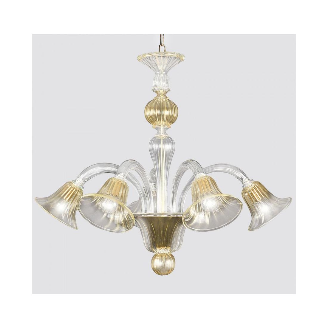Lampadario a sospensione con 5 luci composto dai bracci arcuati in vetro di Murano lavorato a mano da dove pendono i diffusori a campana dove si poggiano le coppette che ospitano le sorgenti luminose; viene prodotto in vetro Trasparente con sfumature in Oro zecchino 24k.