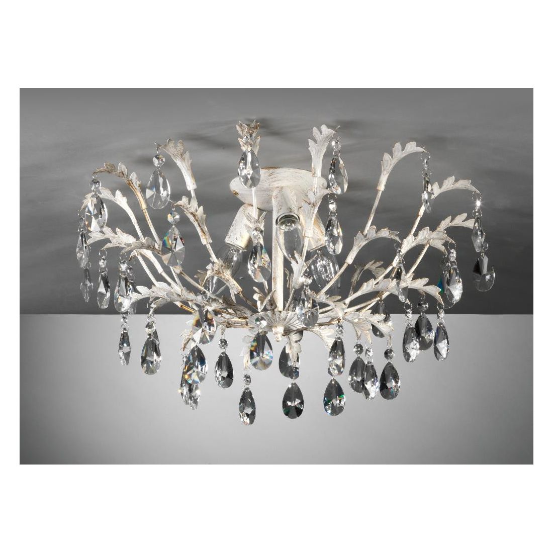 Plafoniera dallo stile classico con 3 luci, con un diametro di cm 55, che si presenta con una struttura interamente realizzata in metallo con finitura Avorio antico con spennellature Oro che si caratterizza per le sue decorazioni composte da piccole foglie in metallo alle quali trovate appesa una goccia di cristallo ciascuna che può ricordare la rugiada del mattino.