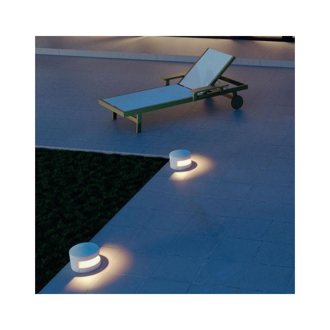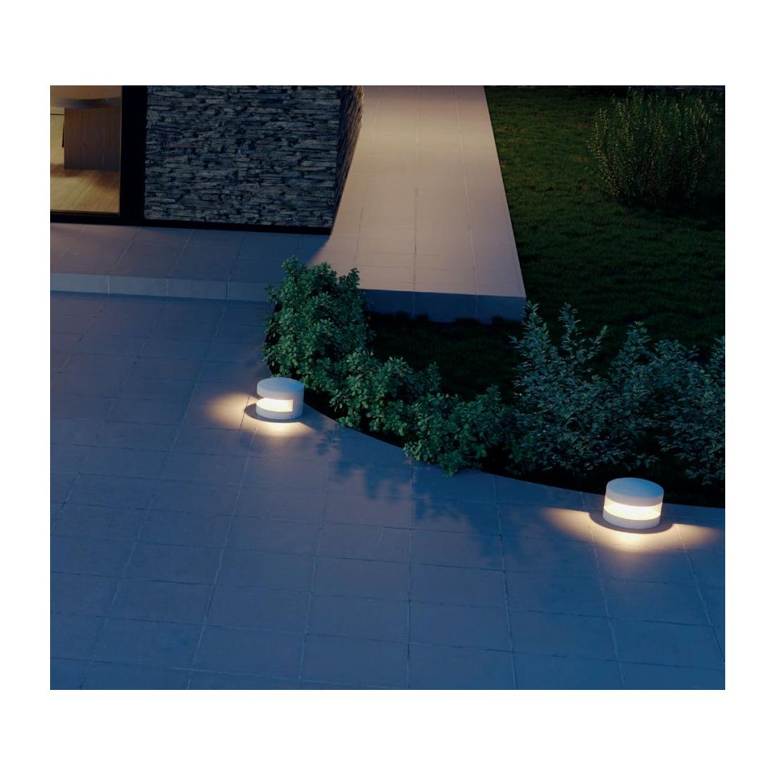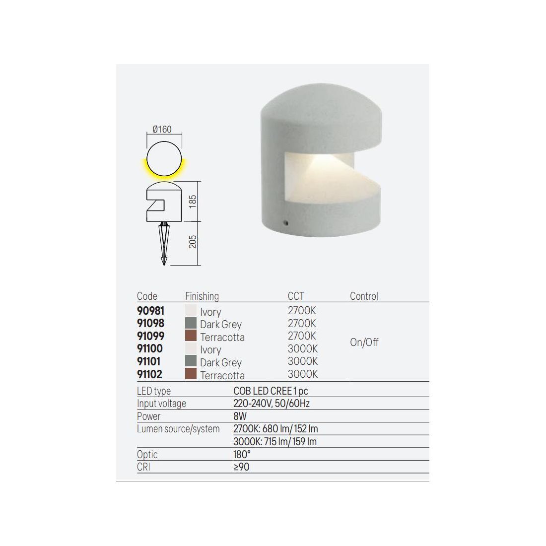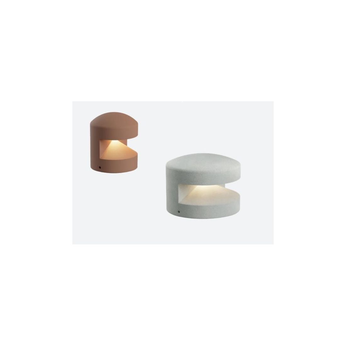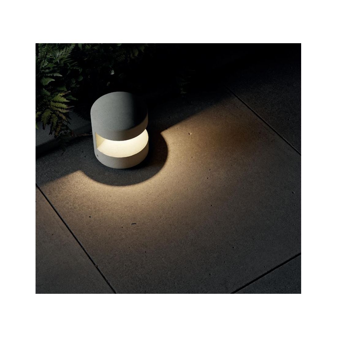 Paletto/Segnapasso, di dimensioni ridotte, progettato per l'illuminazione di ambienti esterni, che si presenta con una struttura compatta e arrotondata realizzata in cemento disponibile nelle finiture Avorio, Antracite e Terracotta con il diffusore in vetro satinato posizionato strategicamente per generare un effetto luminoso suggestivo che avvolge delicatamente l'area circostante con un ottica di 180°.