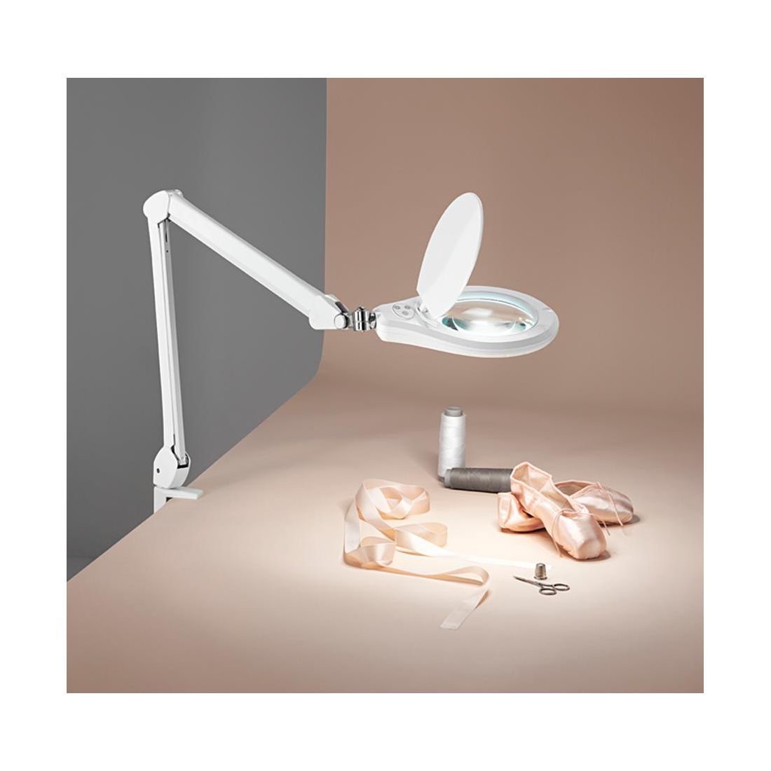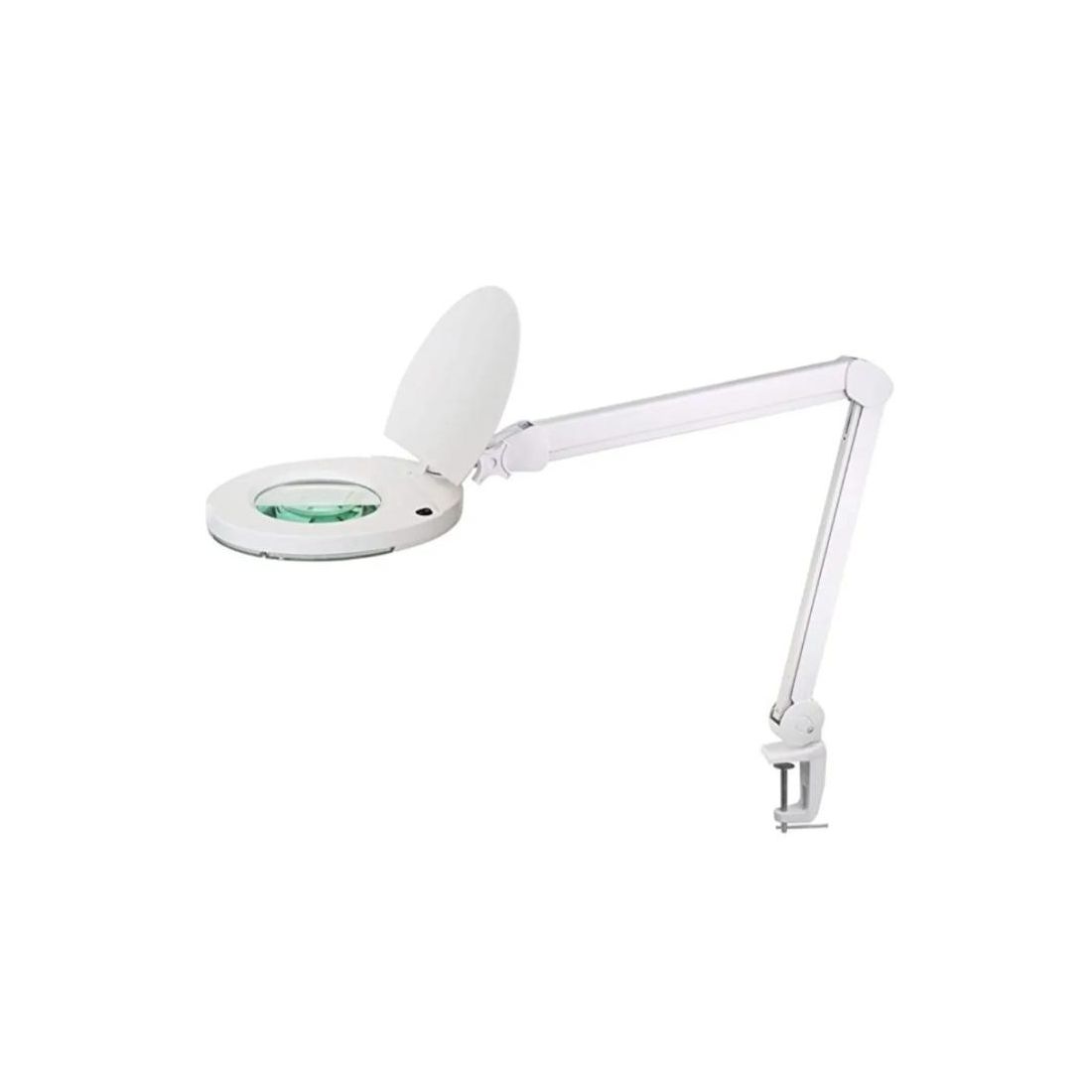 Lampada da tavolo con una struttura realizzata in plastica e metallo di colore bianco completa di un morsetto, di lente da ingrandimento e di interruttore Touch posto sul diffusore.
