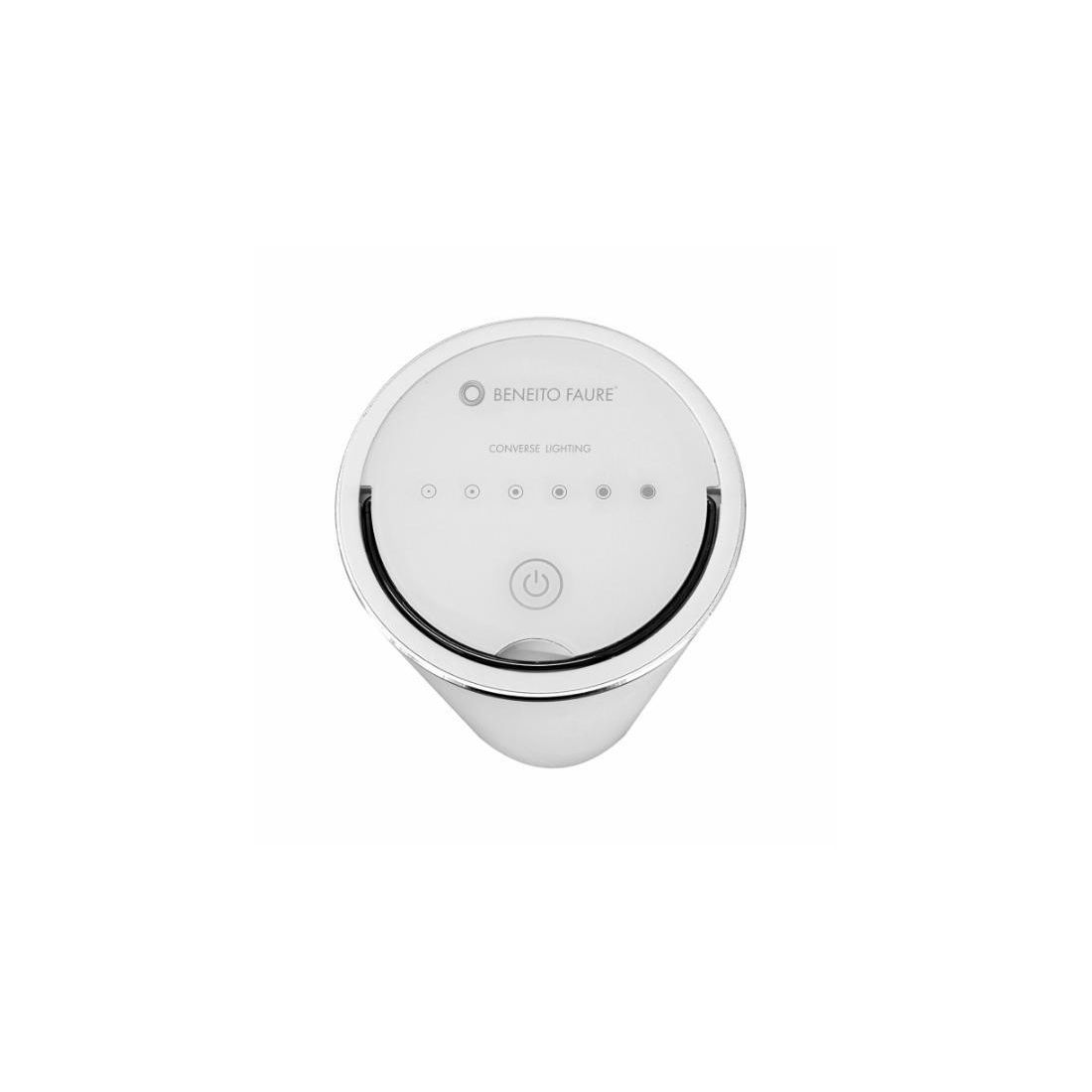 Lampada da appoggio, a batteria, della Beneito Faure, dimmerabile, portatile con una fascio di luce a 360°. E' una lampada che integra un LED DIMMER da 2,5W con il sensore touch per la regolazione dell'intensità della luce in cinque diversi livelli.