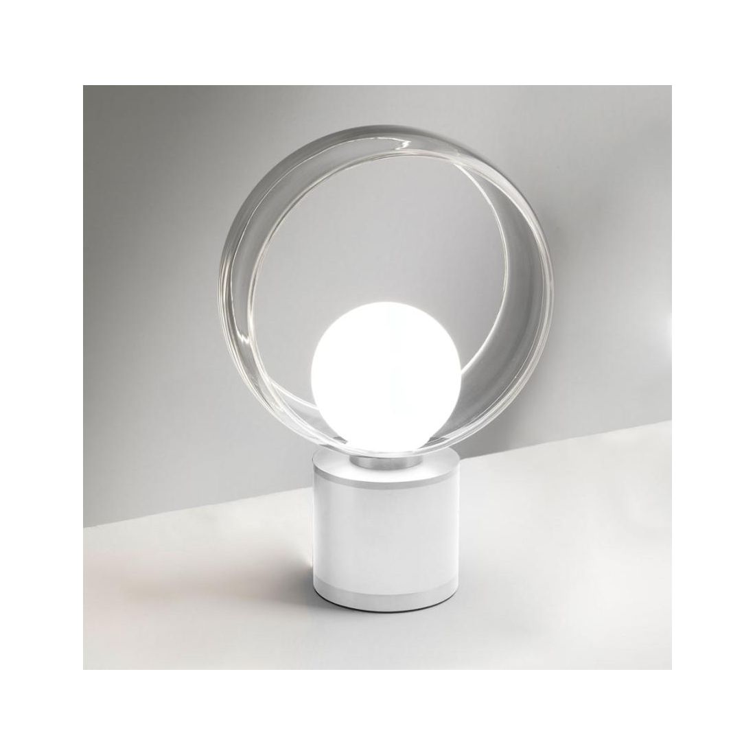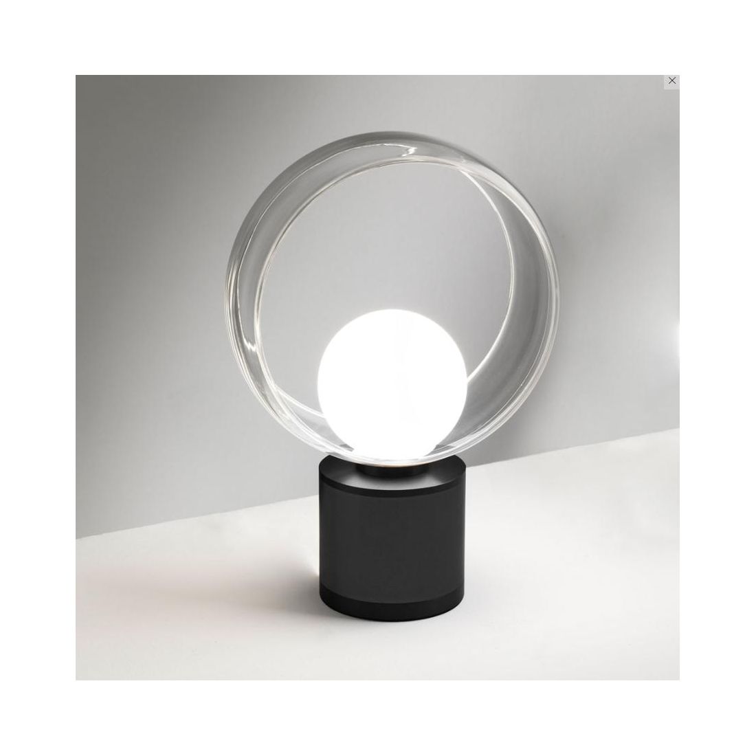 Si presenta con una base del diametro di 8 cm realizzata in metallo con finitura Bianca, Nera oppure Marrone ossidato dove poggia un cerchio in vetro trasparente del diametro di 18 cm con all'interno la lampadina con attacco G9 (non inclusa), che emana una luce diffusa nella stanza.