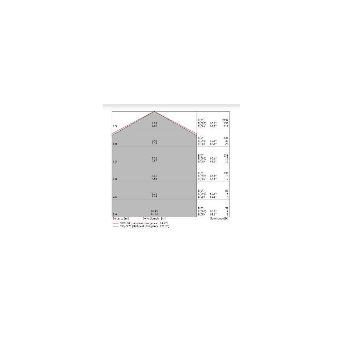 Lampada con la sorgente luminosa LED da 22w, di colore bianco caldo, con distribuzione luminosa General Lighting, è composta da 1 LED topled, con una CCT 3000K ed un CRI 80; il flusso luminoso della sorgente è di 2700 lm, con un'efficienza nominale di 122.7 lm/W.