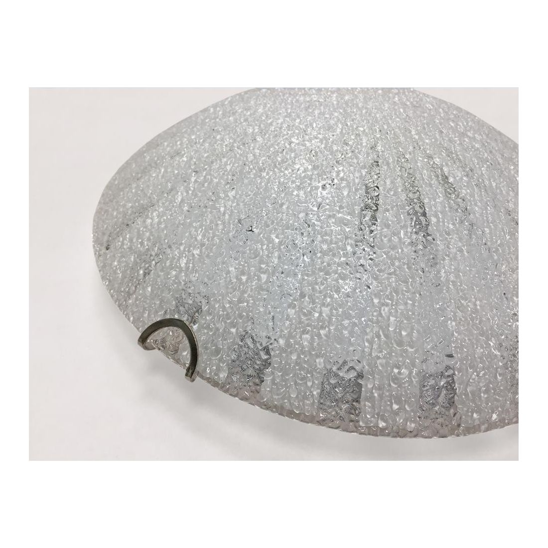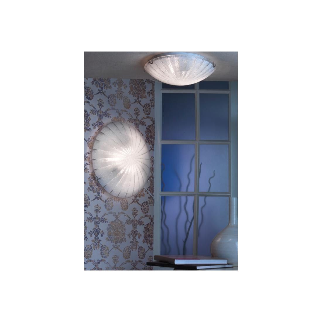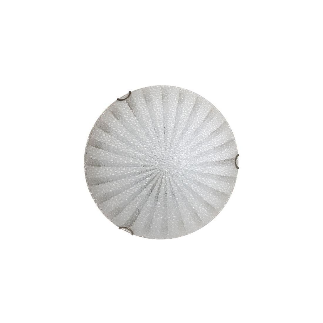 Plafoniera con montatura in metallo cromo e con il diffusore, di forma rotonda diametro cm 30, in vetro con una lavorazione a "buccia d'arancia" che dà un tocco di unicità a questo prodotto.