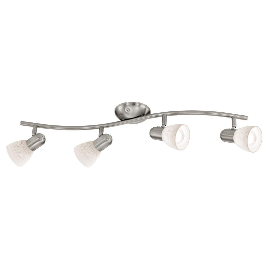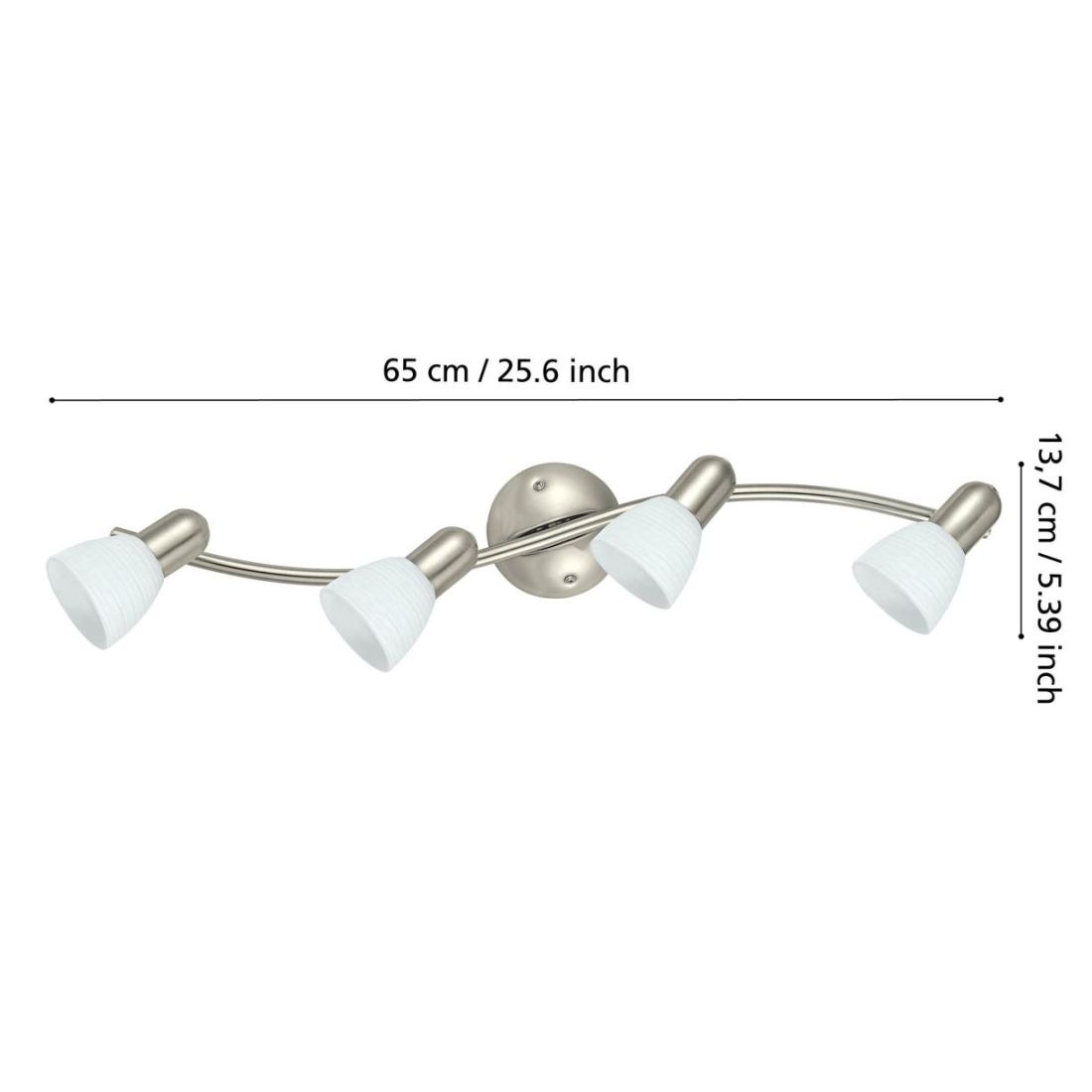 Plafoniera moderna che si presenta con una struttura, leggermente ondulata, realizzata in metallo con finitura Nichel opaco combinata a quattro faretti con il paralume in vetro bianco, realizzato con la tecnica dello strofinamento, che aggiungono una texture visiva unica e assicurano anche una diffusione della luce morbida e omogenea priva di abbagliamenti. La caratteristica principale sono i diffusori completamente orientabili che consentono di direzionare i flussi luminosi con estrema precisione permettendo di enfatizzare e illuminare in modo mirato punti specifici dell'ambiente.