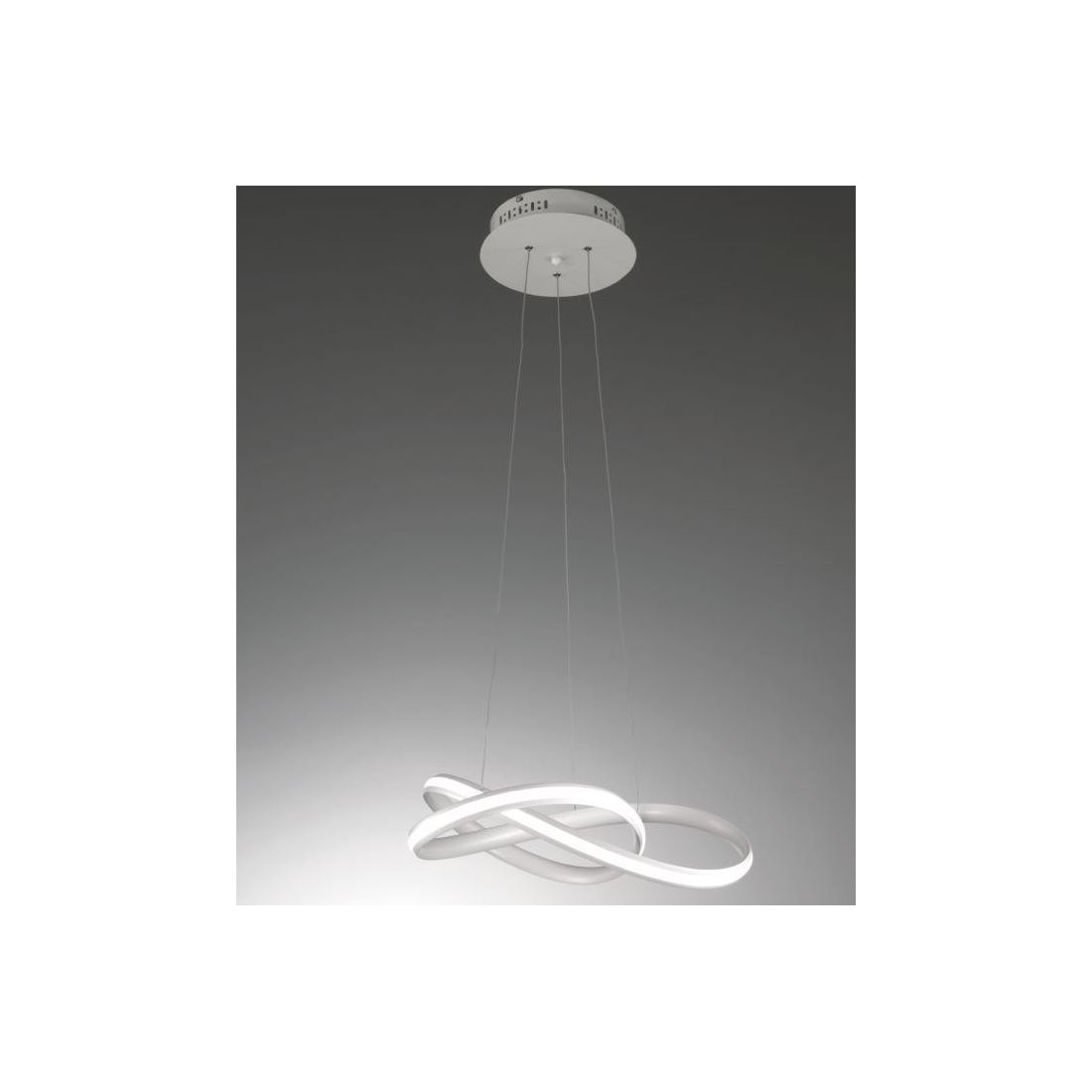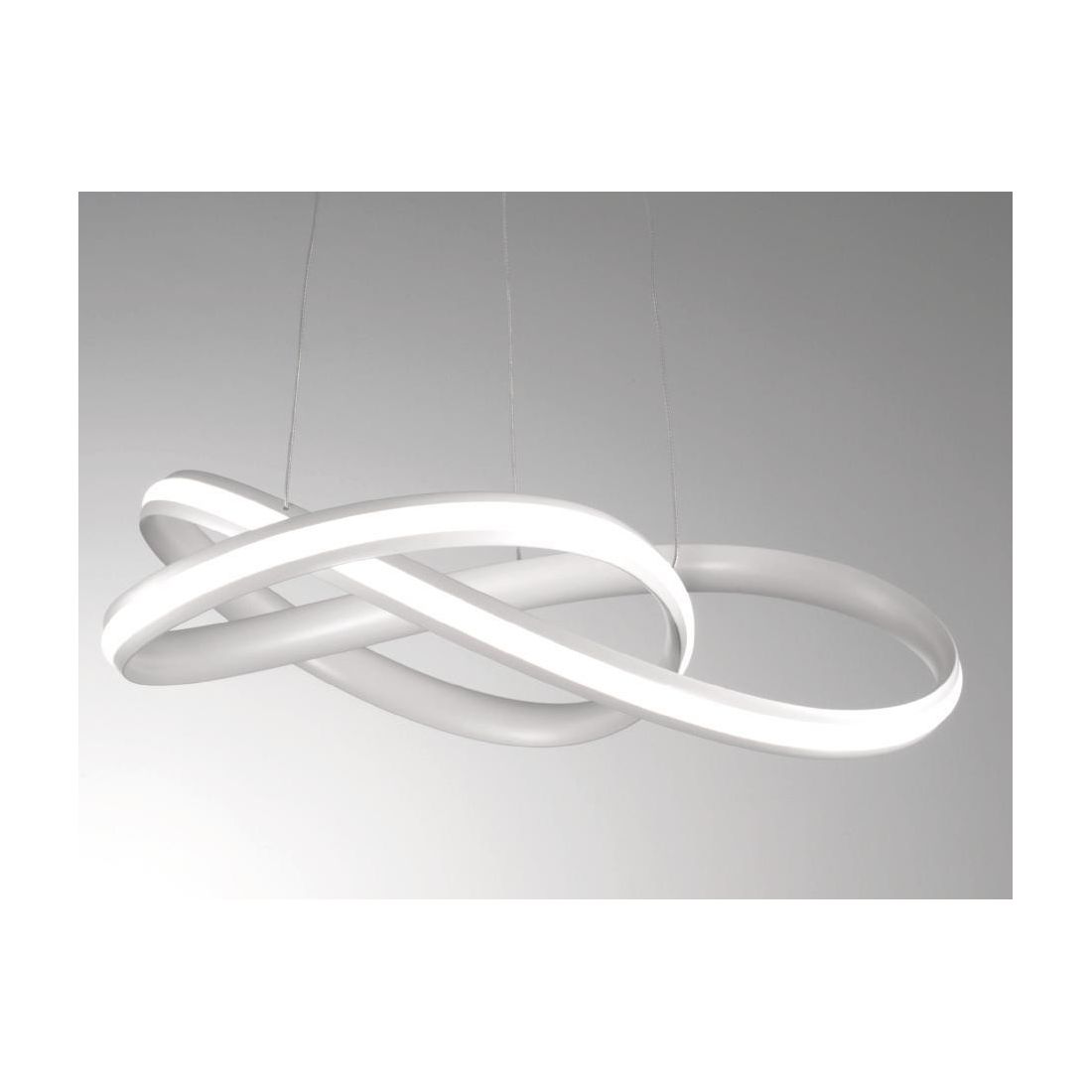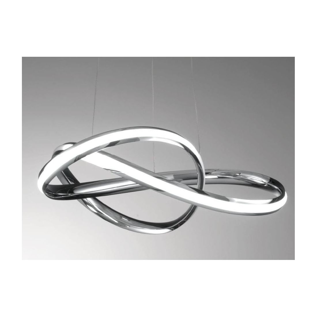 Daytona è un lampadario dal design moderno composto da una base rotonda a soffitto e da due anelli incrociati tra loro il tutto realizzato in metallo verniciato bianco oppure con finitura Cromo lucido (a vostra scelta); sospensione con una forma sinuosa e con una resa luminosa d'effetto in quanto si differenzia dagli altri prodotti per il posizionamento esterno della striscia a led che diffonde luce in tutta la stanza.