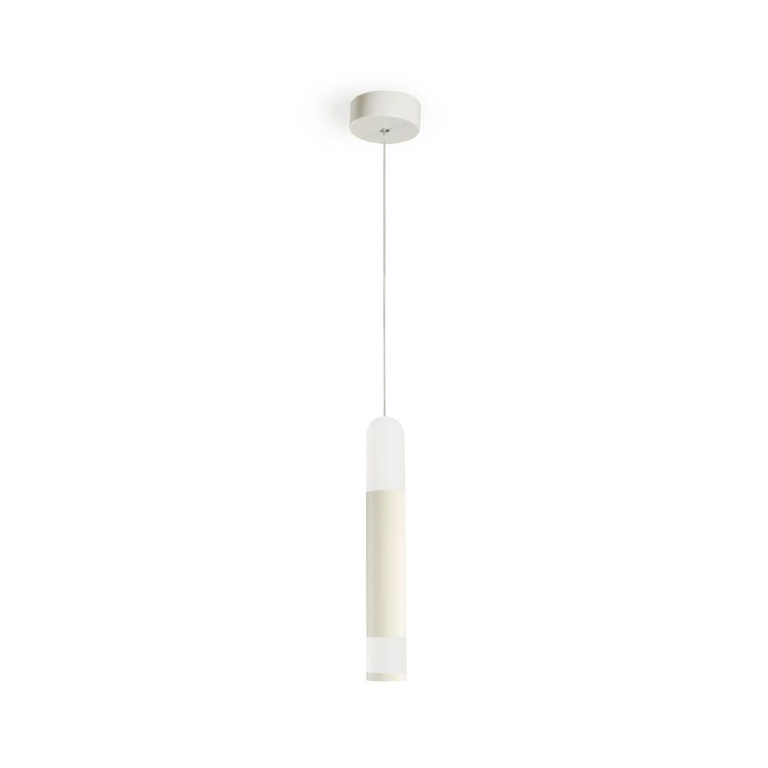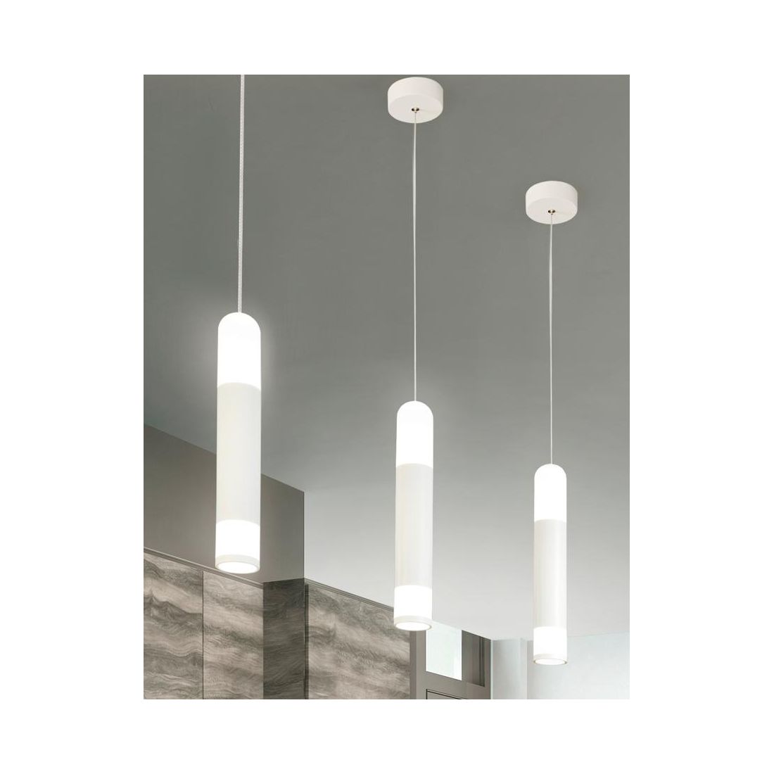 Derby sospensione singola moderna composta da basetta al soffitto tonda diametro 10 cm e corpo illuminante cilindrico Bianco, con bi-emissione di luce, con il corpo centrale in metallo verniciato e due diffusori in acrilico satinato uno sopra e uno sotto per la diffusione della luce.