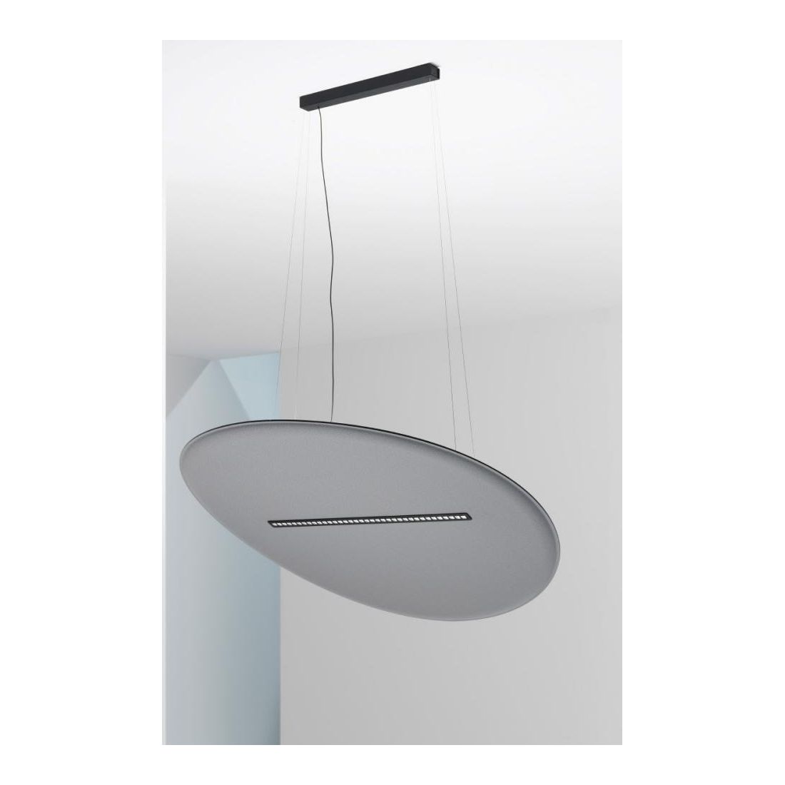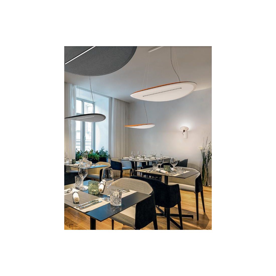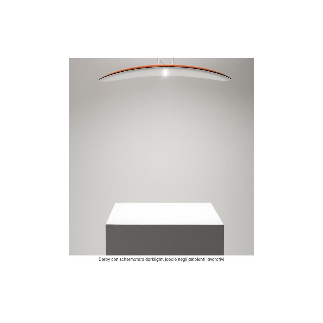 La sospensione Derby, dal design ultramoderno, è una parabola orientabile realizzata in materiale fonoassorbente rivestita in tessuto che integra un’illuminazione sia indiretta, verso l'alto, sia diretta verso il basso con una schermatura Darklight per il controllo dell’UGR ideale negli ambienti lavorativi per ridurre l’abbagliamento e migliorare il comfort visivo e acustico.