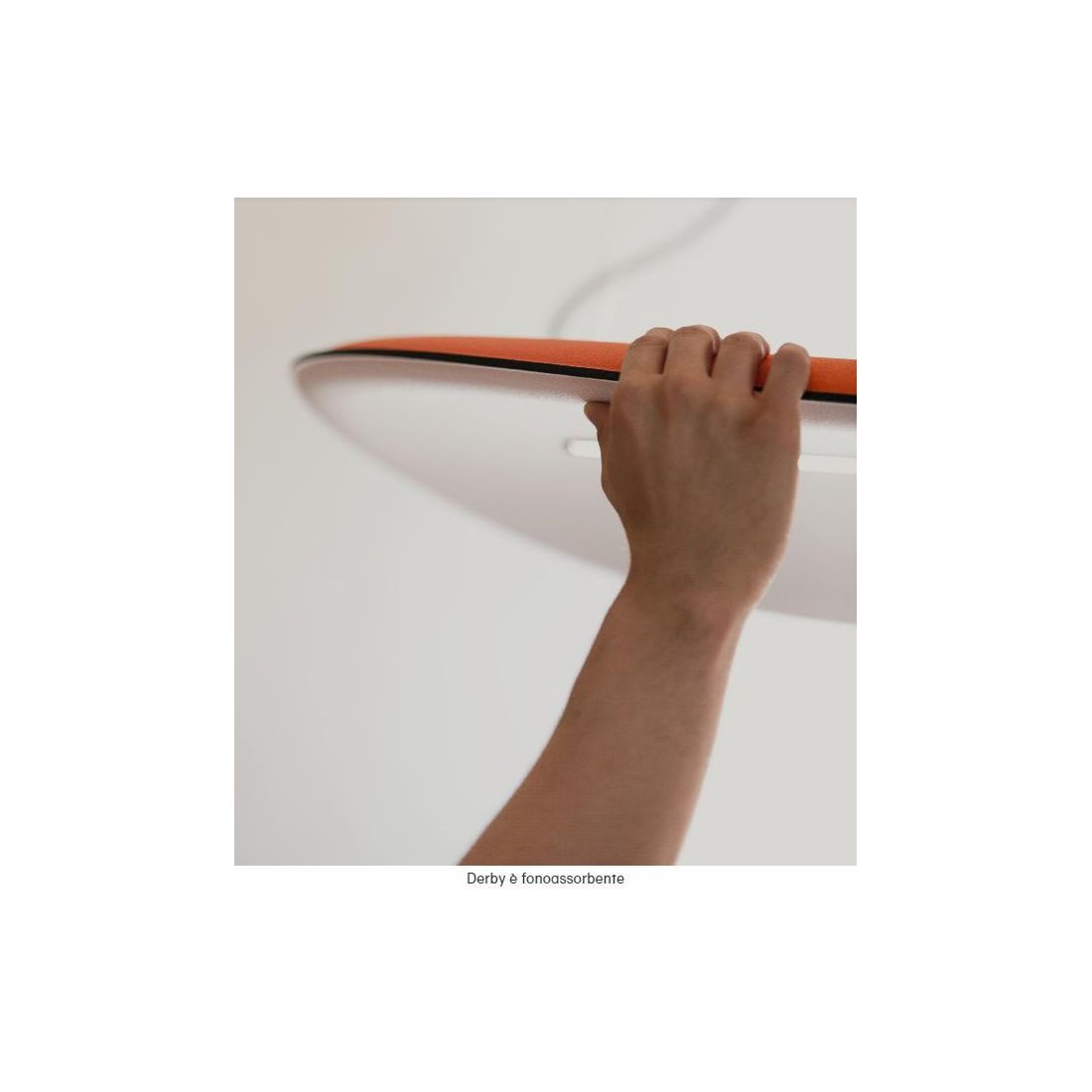 La sospensione Derby, dal design ultramoderno con parabola orientabile che integra un’illuminazione diretta verso il basso; il corpo lampada è realizzato in 100% fibra di poliestere in fiocco fonoassorbente rivestita in tessuto nelle colorazioni Grigio, Bronzo oppure bicolor Arancio/Bianco con il bordo laterale nero e con coprifilo in metallo verniciato bianco (con tessuto arancio/bianco) oppure nero (con tessuto grigio o marrone).