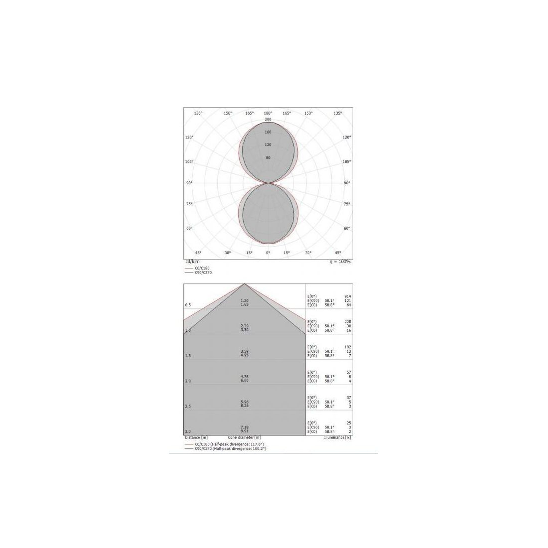Lampadario con luce Dimmerabile DALI la cui sorgente luminosa LED da 28w, di colore bianco caldo, con distribuzione luminosa General Lighting, è composta da 72 LED topled, con una CCT 3000 K ed un CRI 90; il flusso luminoso della sorgente è di 3497 lm, con un'efficienza nominale di 124.9 lm/W.