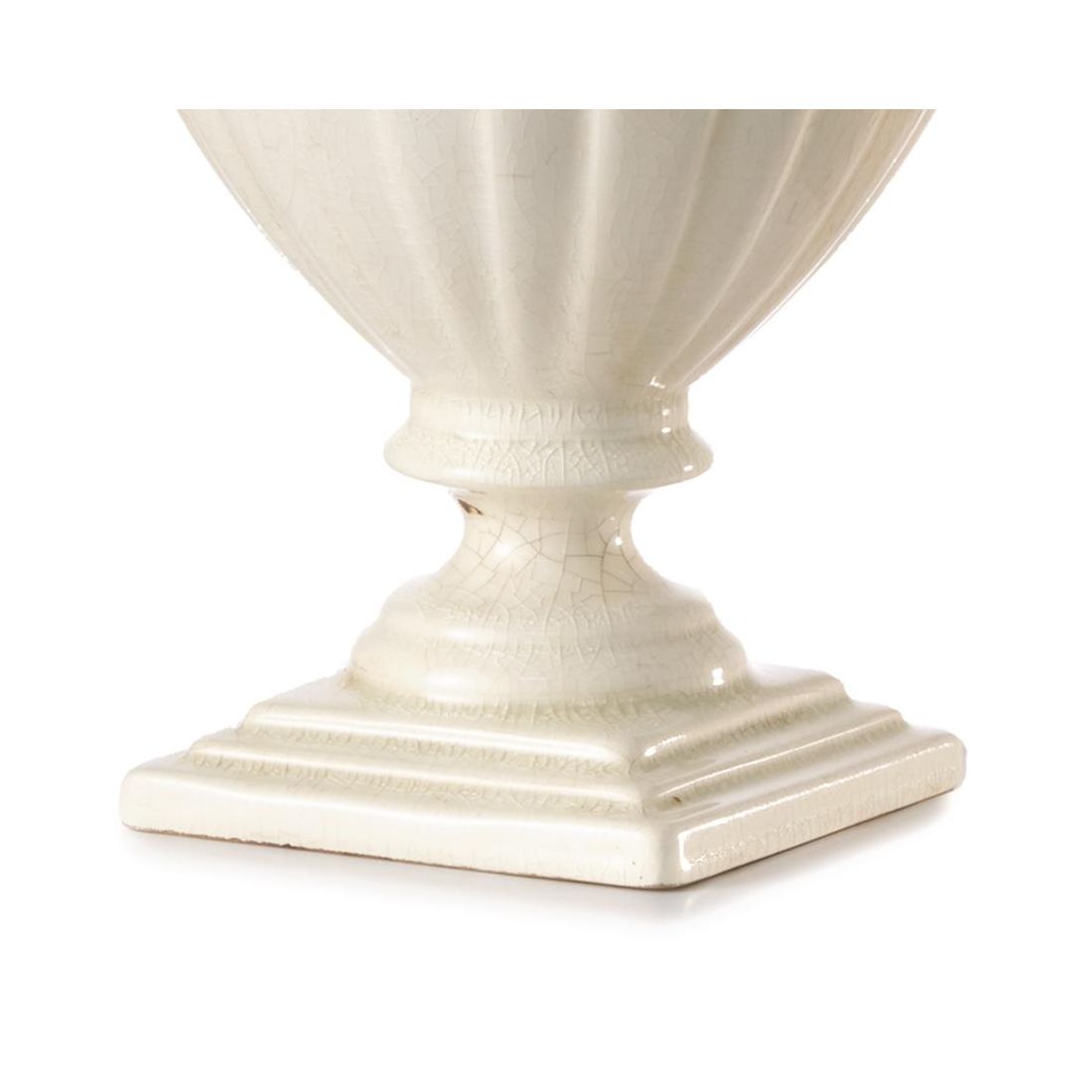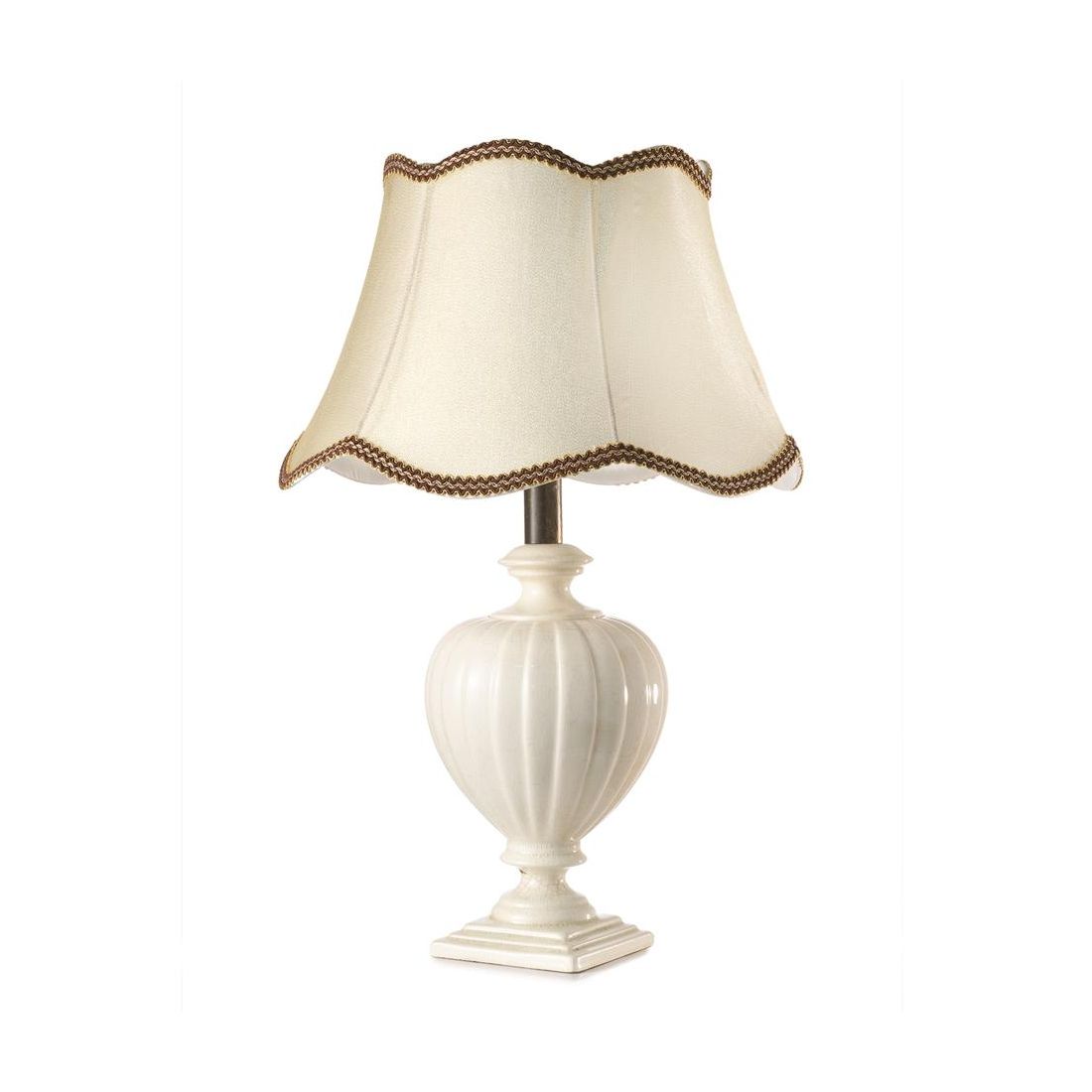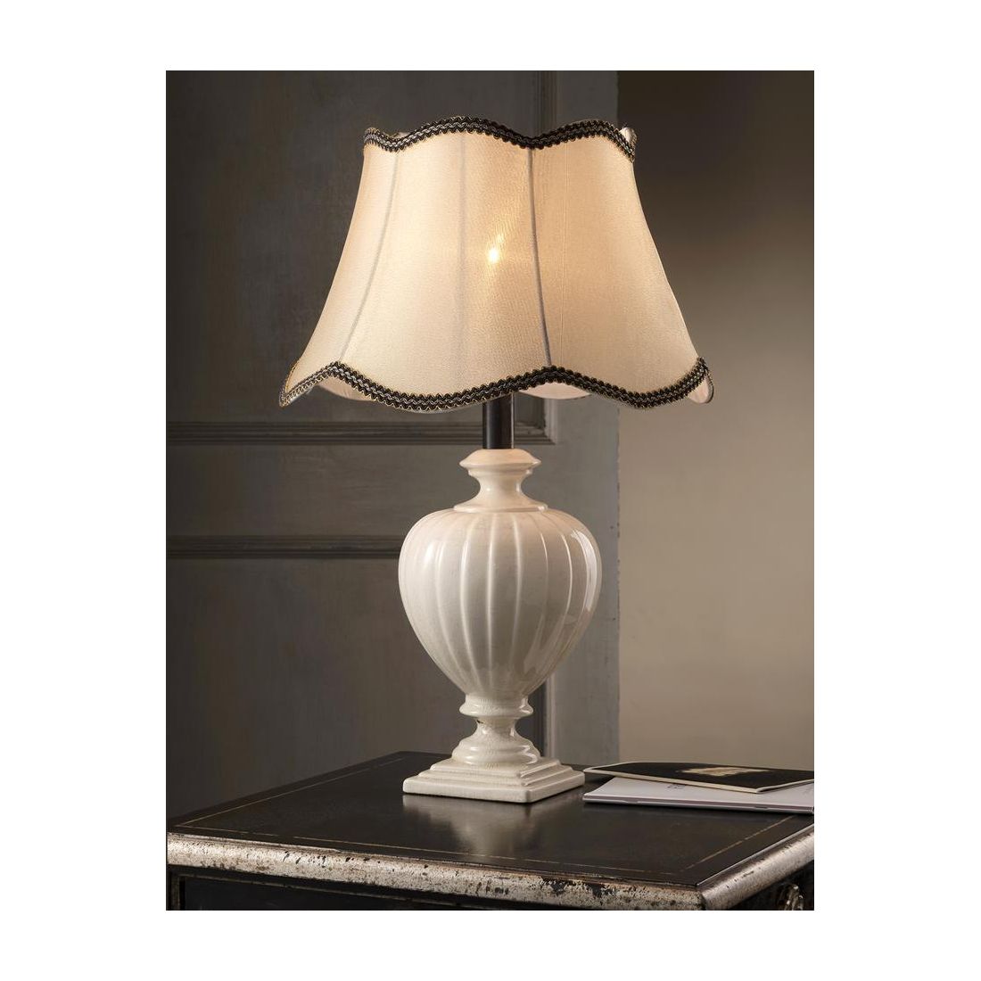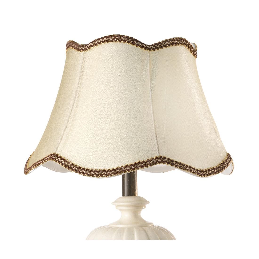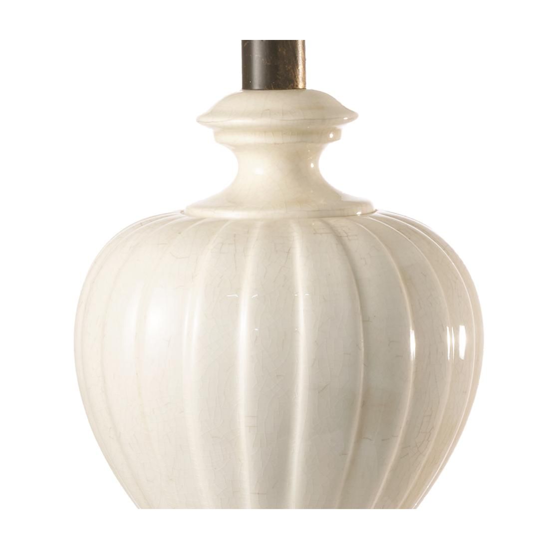 Lampada da tavolo dallo stile classico che si presenta con una base realizzata in ceramica claques di colore Bianco, con effetto finemente screpolato; questa finitura, che richiama lo stile anticato, conferisce profondità e carattere al complemento d'arredo. Il paralume è realizzato in tessuto con finitura Sabbia impreziosito da cuciture a contrasto marroni che ne delineano la forma con un dettaglio sartoriale di grande impatto visivo.